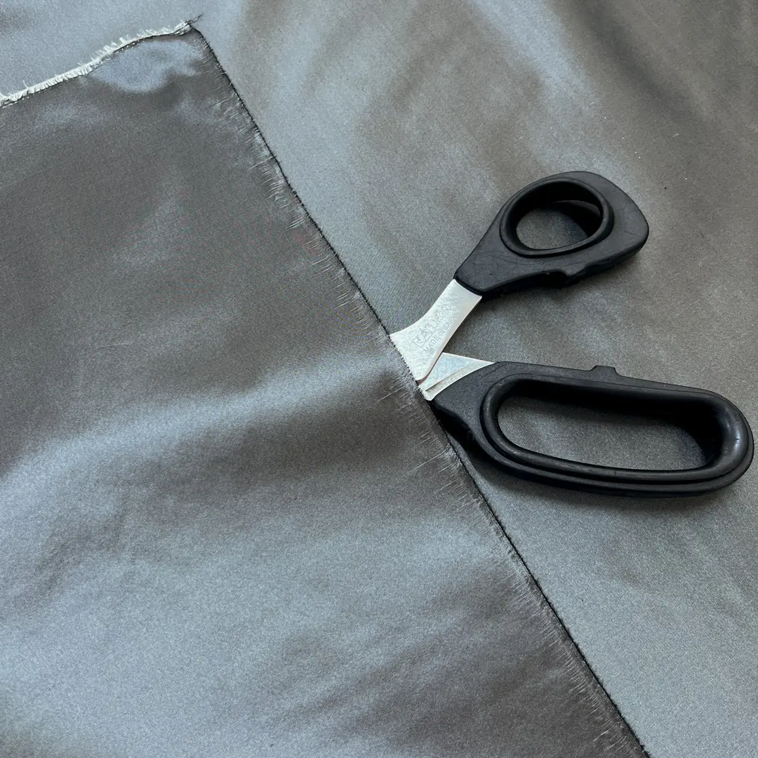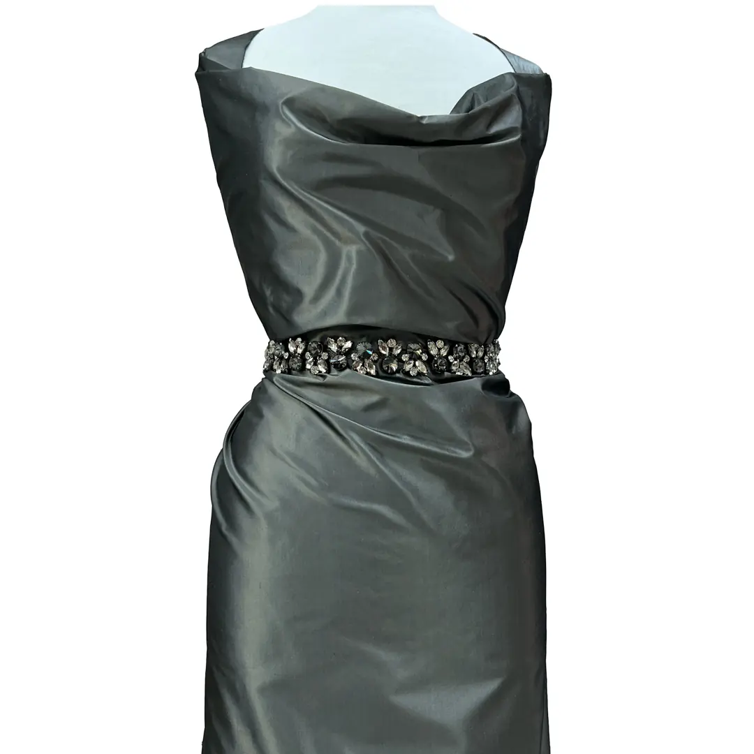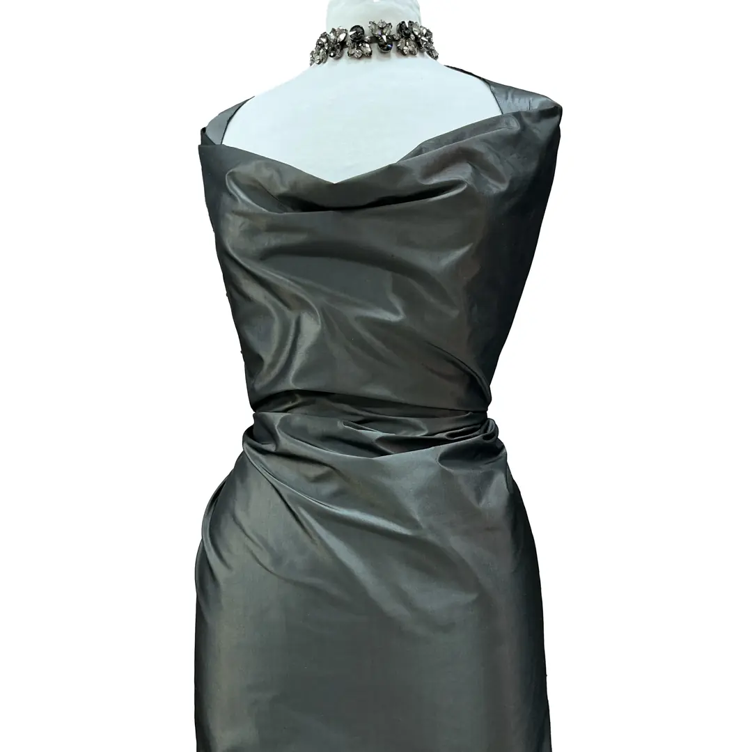 Pregiato taffetà di pura seta Made in Italy, dal caratteristico colore grigio canna di fucile — una tonalità intensa e metallica che conferisce profondità visiva e una sofisticata sobrietà.