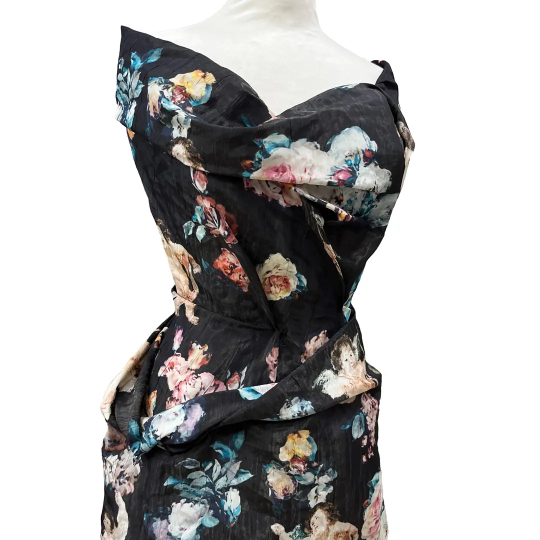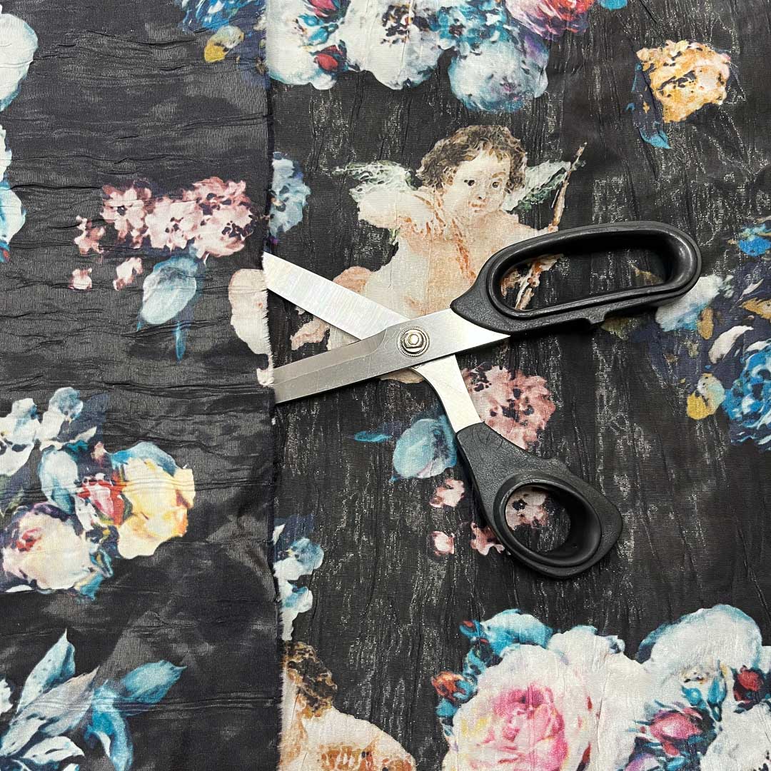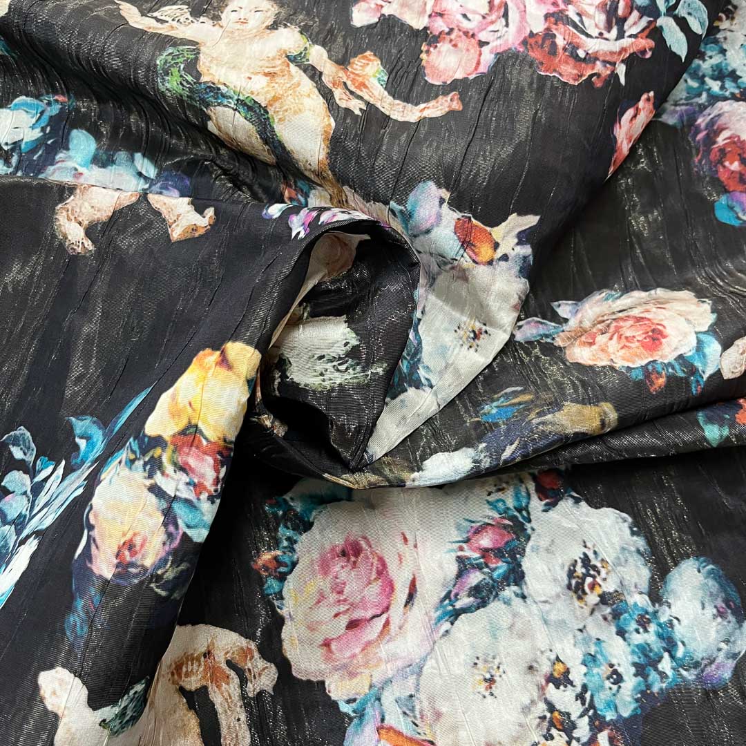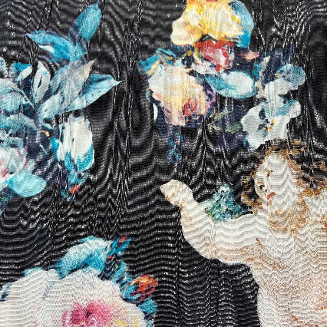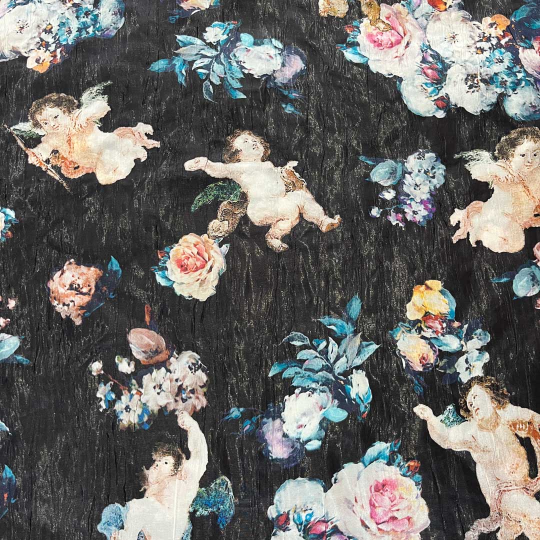 Con base di colore nero leggermente cangiante che vira verso l’argento, impreziosito da bouquet di fiori e rose dai toni delicati del rosa, azzurro e lilla, accompagnati da eleganti angioletti.