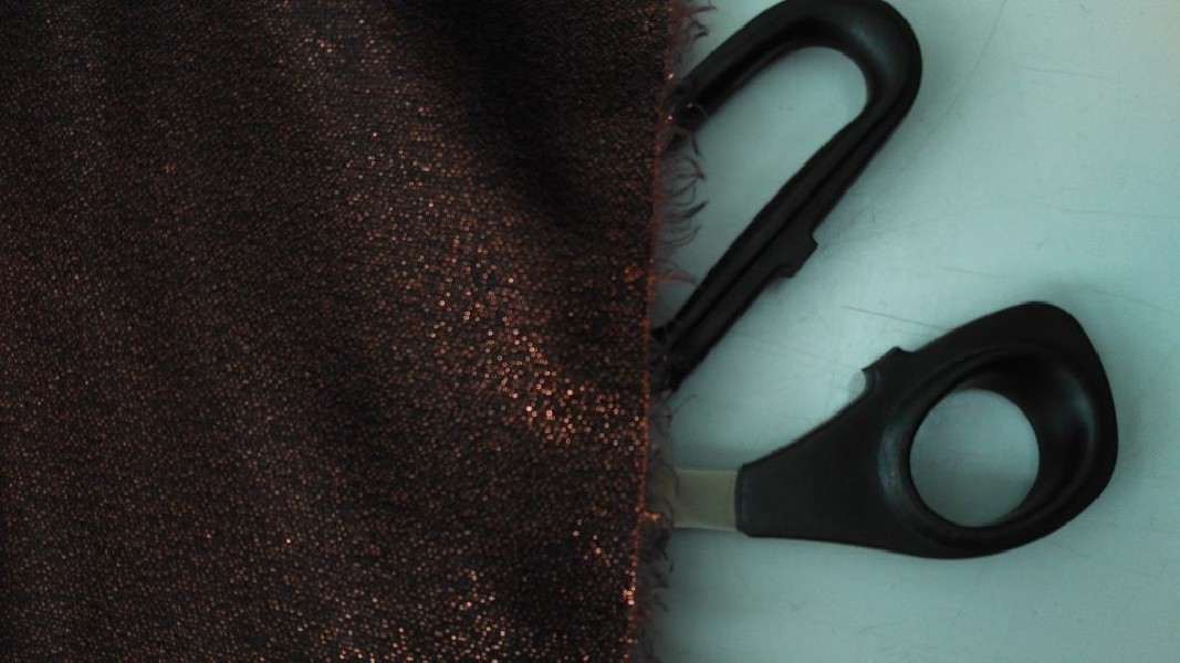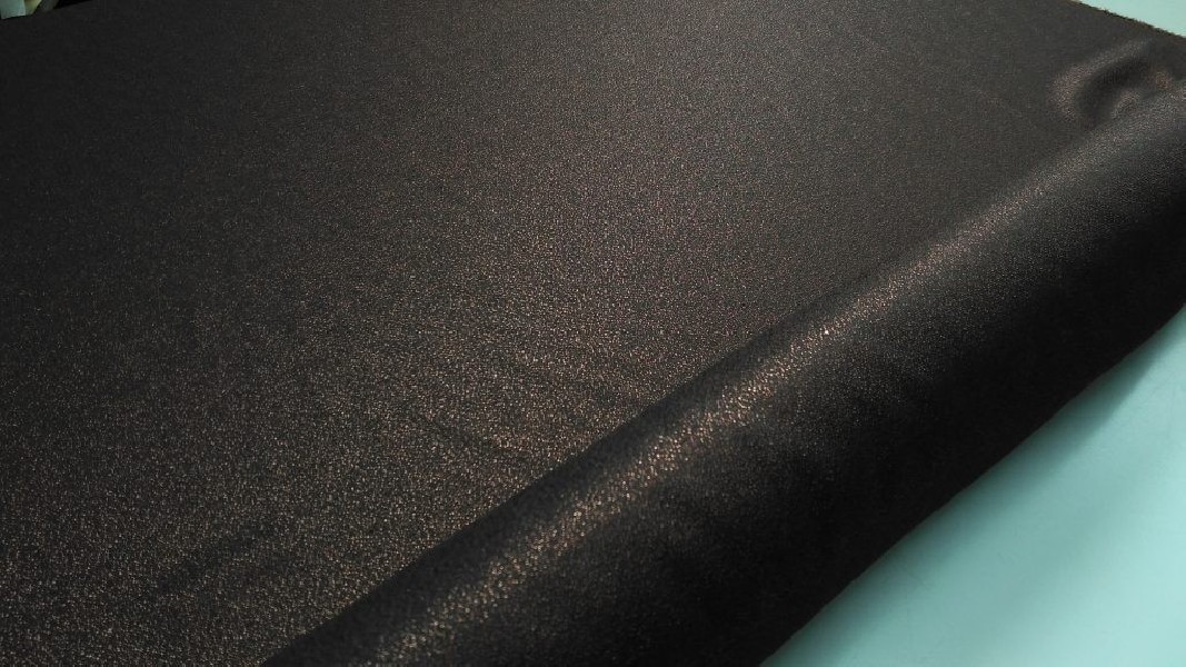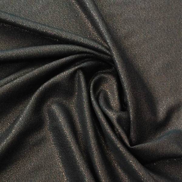 Il tessuto d’abbigliamento in altezza 140 cm, caratterizzato da una superficie bronzo finemente glitterata che riflette la luce in modo discreto ma continuo, conferendo un effetto visivo caldo e sofisticato.