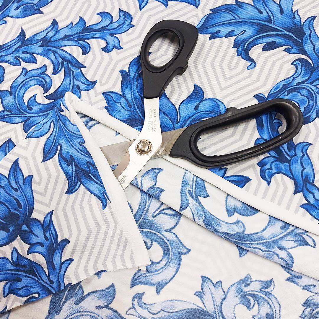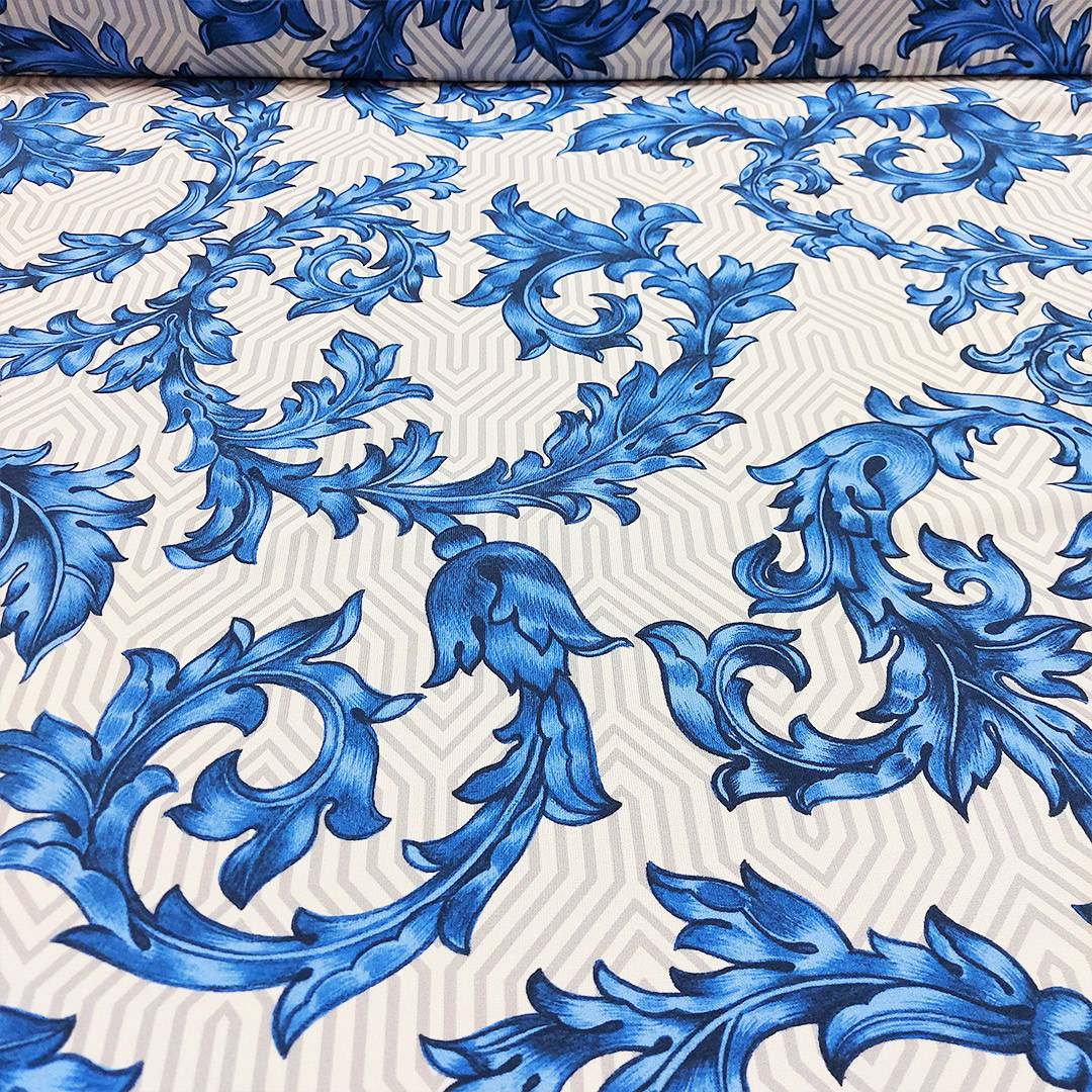 Elegante tessuto bielastico con stampa con base di colore bianco impreziosita da intrecci d’edera in blu in doppio tono chiaro e scuro, per la sua elevata vestibilità è ideale sia per qualsiasi capo d’abbigliamento.