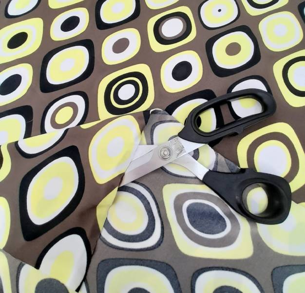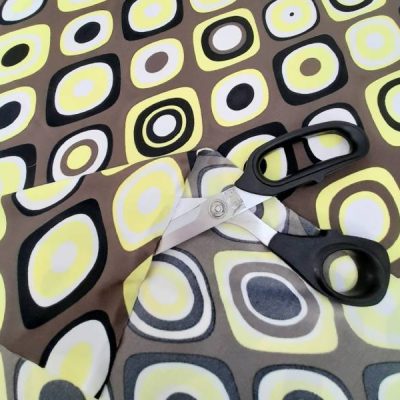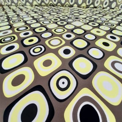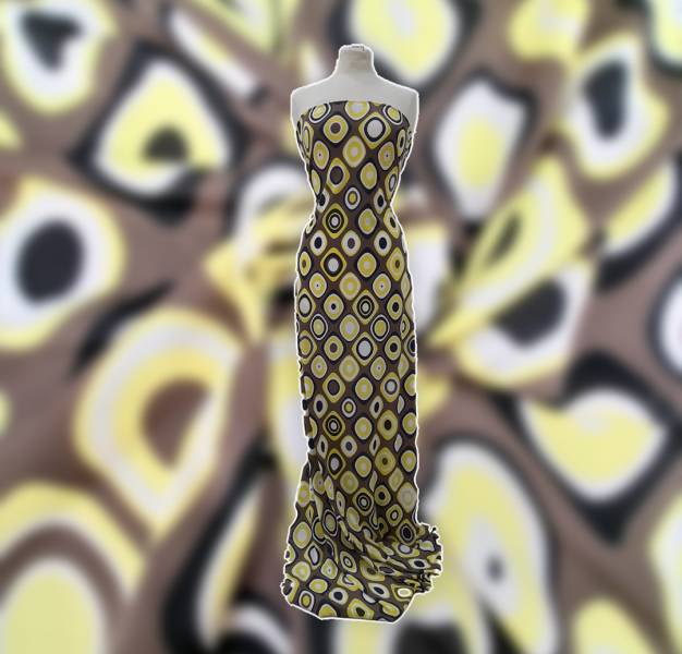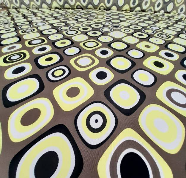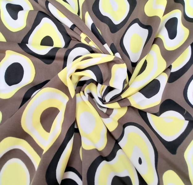 Particolare tessuto bielastico con stampa a effetto optical con colore di base marrone e figure geometriche astratte di colore giallo in contrasto, adatto per capi d’abbigliamento estivi e chi vuole stupire.