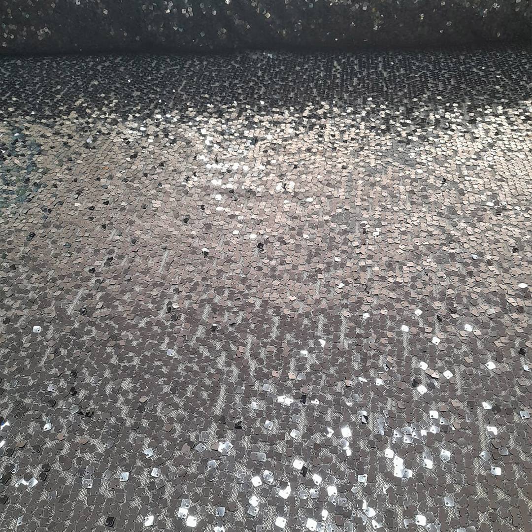 Tessuto a base tulle nero elasticizzato con paillettes di media dimensione a forma quadrata di colore nero e bellissimi riflessi marroni. Ideale per capi da cerimonia e da sera, dal tocco glamour!