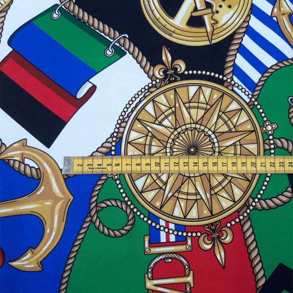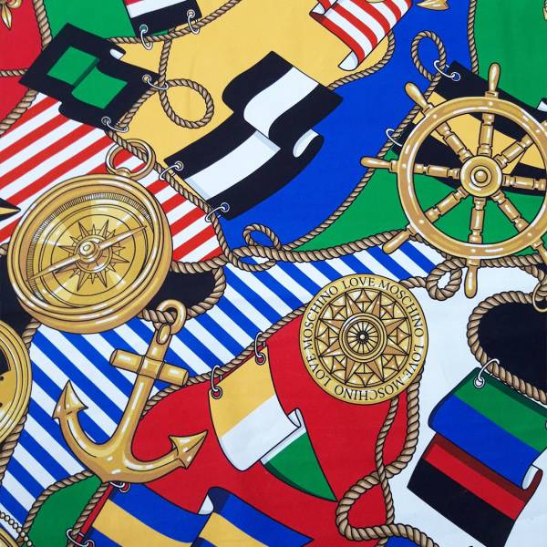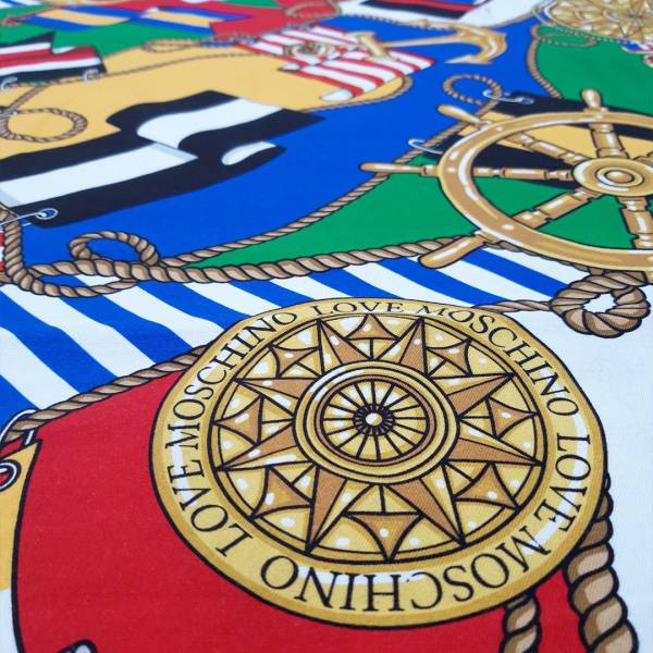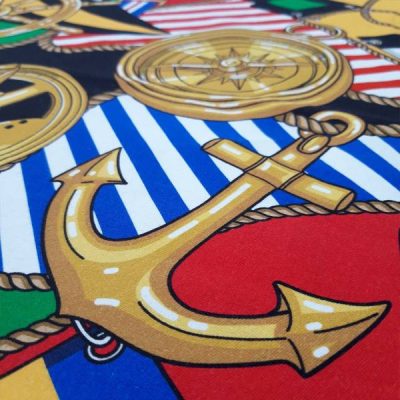 Tessuto in cotone elasticizzato e coprente, dalla stampa multicolore che variano dal rosso, blu e verde, con elementi a tema marittimo come bussole e àncore in colore giallo “oro” e piccole bandiere colorate.
