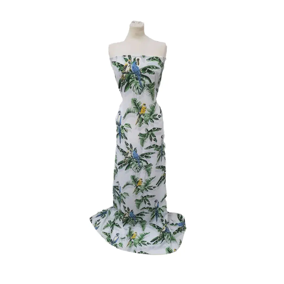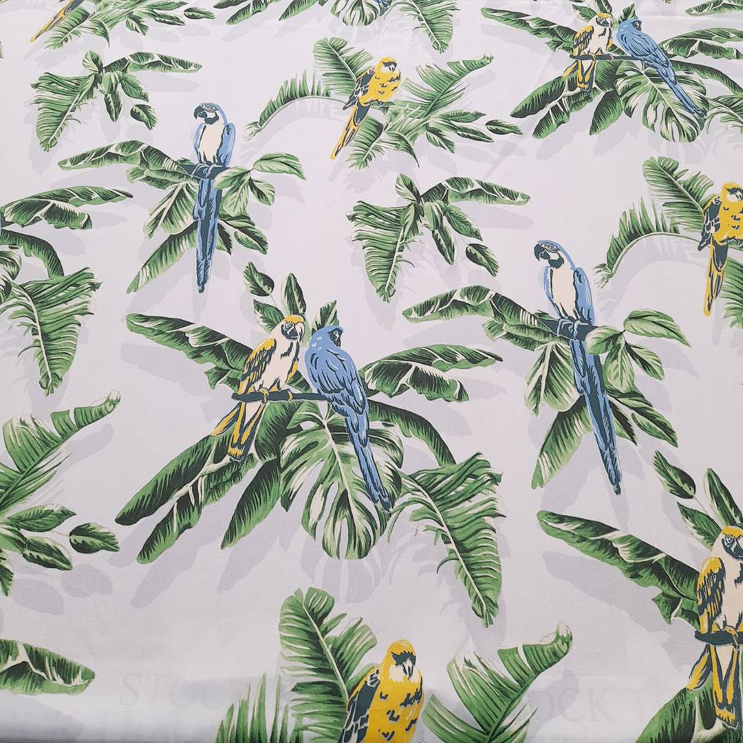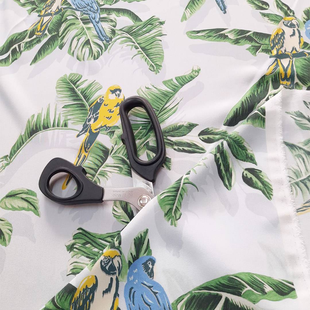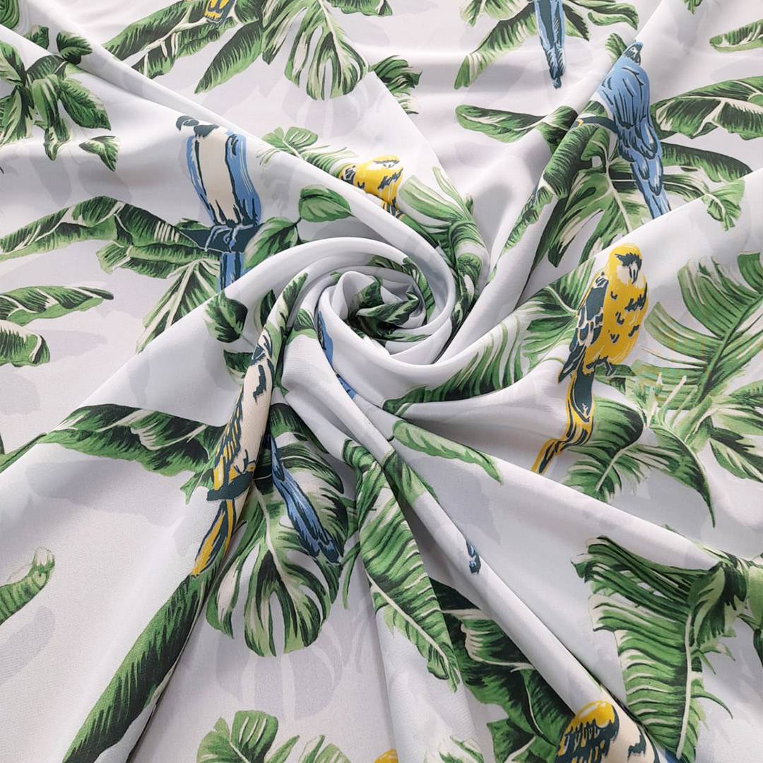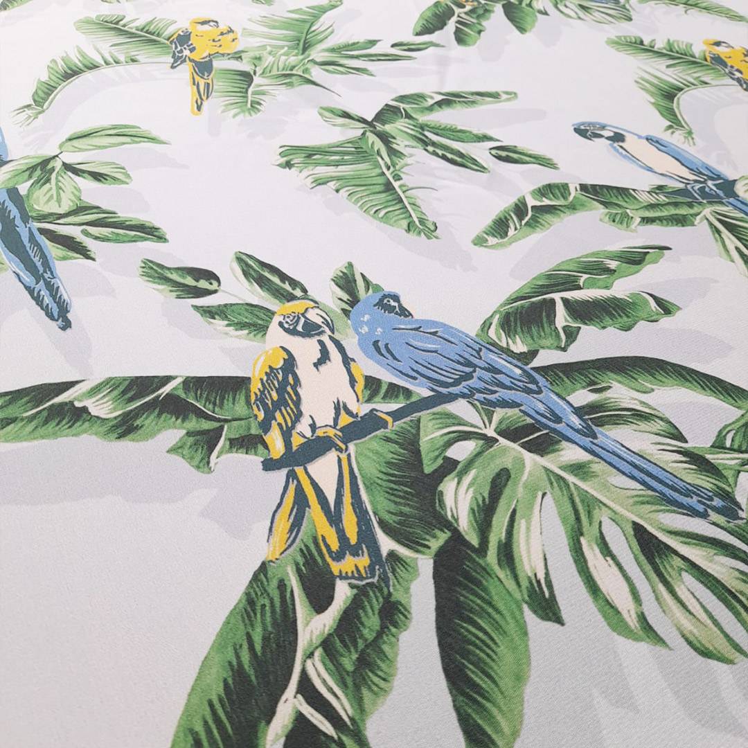 Bellissima seta morbida con base di color azzurro ghiaccio, coprente, con stampa che richiama la natura rappresentata da palme verdi e pappagalli colorati in azzurro e giallo, adatto per qualsiasi capo d’abbigliamento.