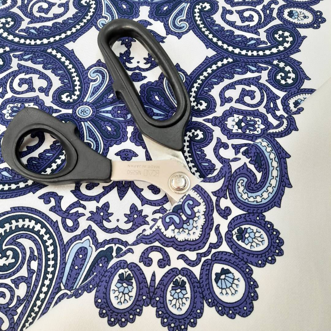 Bellissimo tessuto in cotone con stampa di colore di base bianco e decorazioni astratte di colore blu cobalto e alcuni accenni di azzurro. Ideale per qualsiasi capo d’abbigliamento.