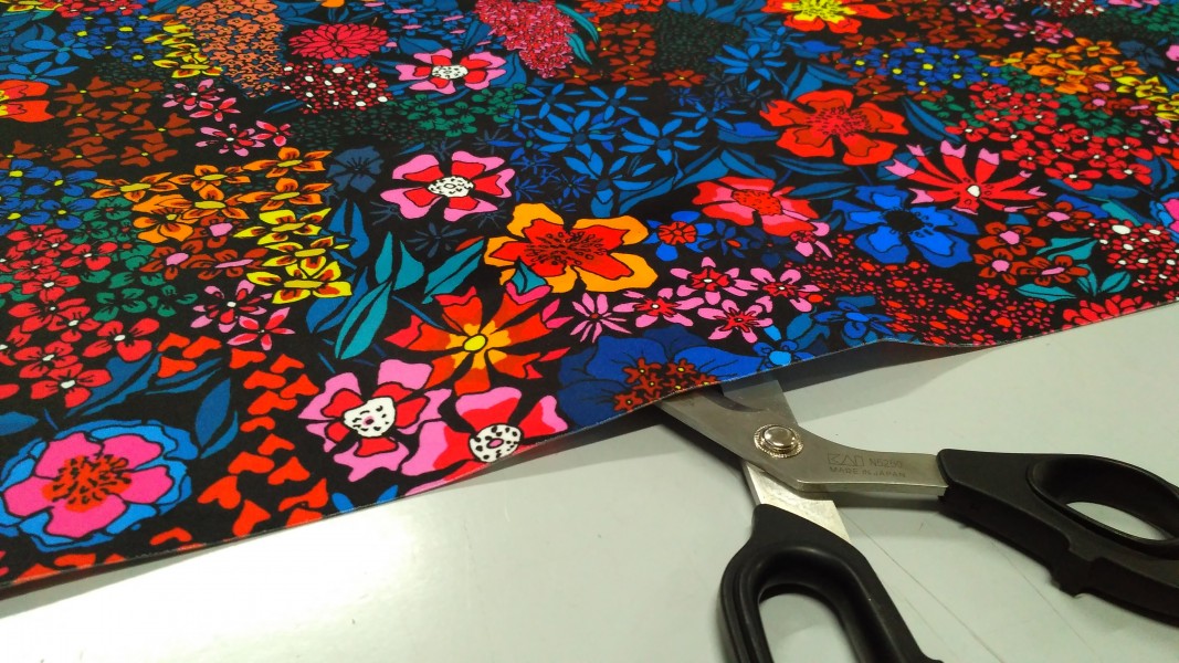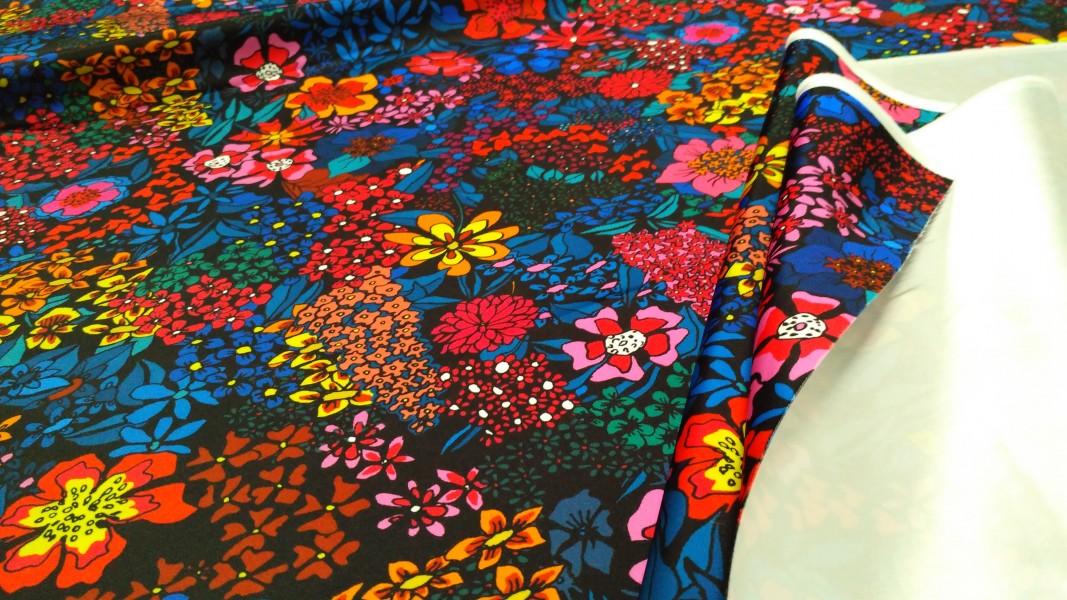 La fantasia floreale multicolore alterna tinte calde e fredde, dando vita a un motivo dinamico e molto decorativo. Il tessuto ha una superficie liscia al tatto e una bella caduta, adatta a modelli con un po’ di volume ma sempre morbidi e confortevoli da indossare nella vita di tutti i giorni.