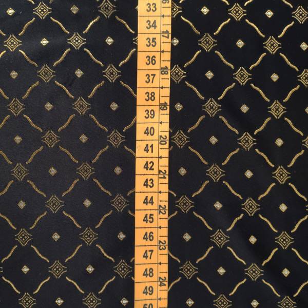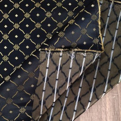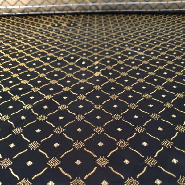 I rombi dorati intrecciati con maestria sullo sfondo nero conferiscono al tessuto un tocco barocco, evocando l’opulenza e la raffinatezza di un’epoca passata.