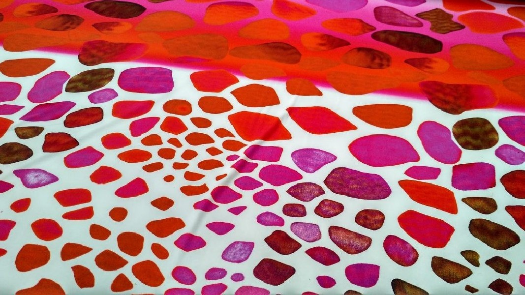 La fantasia del tessuto è maculata e i colori sono rosa confetto e rosso vivo, con accenti arancione pompelmo.