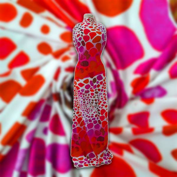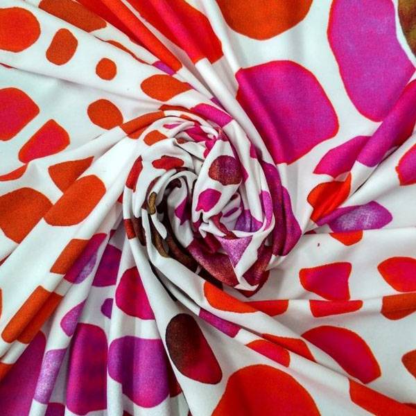 Questo tessuto in maglina bielastica è con stampa maculata. Il tessuto è coprente e di ottima qualità.