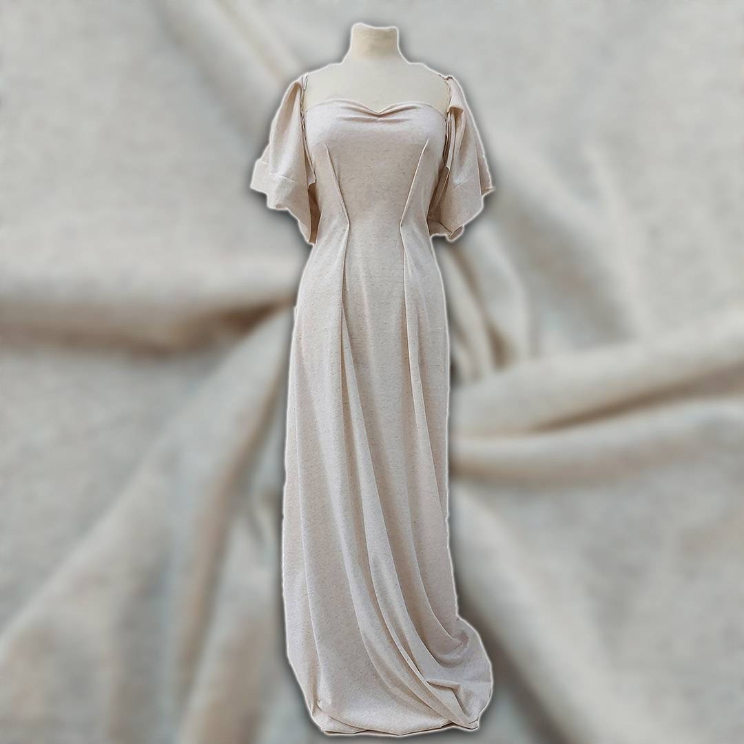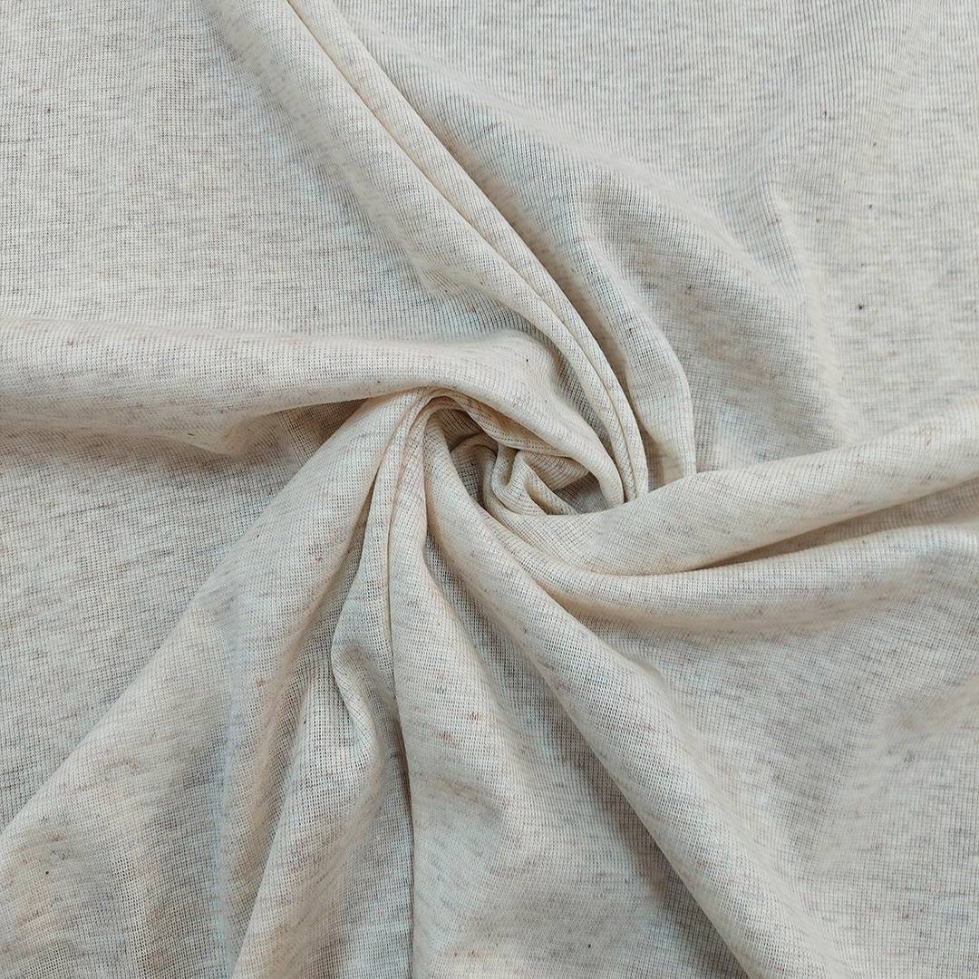 Tessuto a maglia, di grande qualità, dal tatto morbido, colore beige chiaro con piccole sfumature più scure che danno movimento al tessuto, adatto per abiti estivi e da notte come ad esempio le vestaglie.