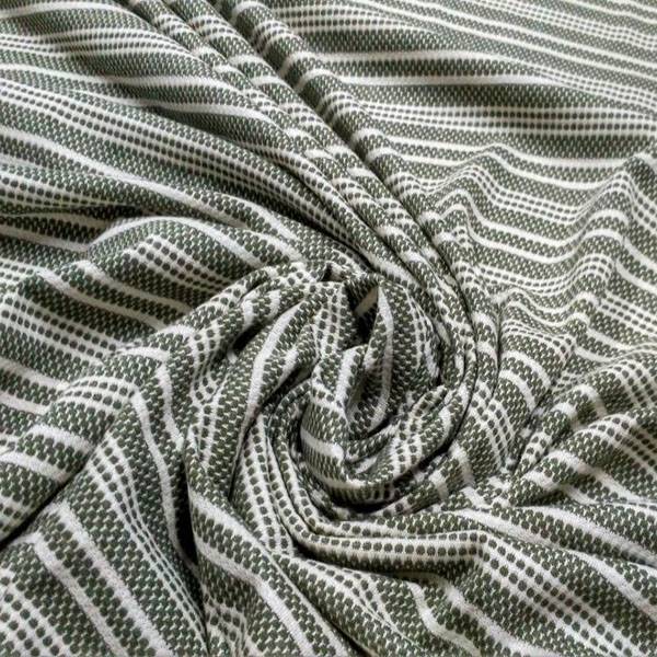 Tessuto Maglina morbidissima a costine con righe color verde oliva e bianco ottico. Ideale per realizzare vestiti, felpe, maglie e t-shirt. Ideale anche per pigiami leggeri, confortevoli e soffici.
