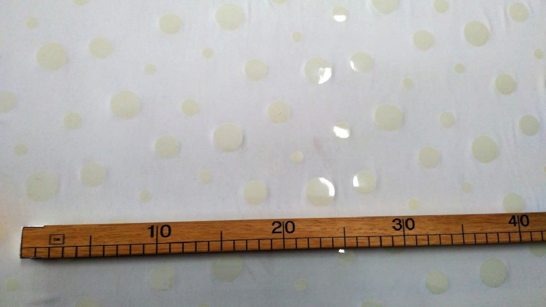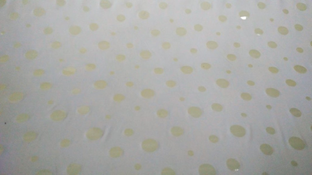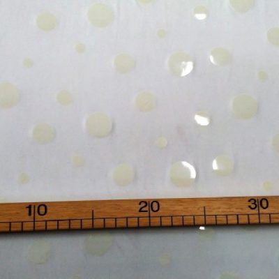 Tessuto in maglina elasticizzata color latte a pois lucidi