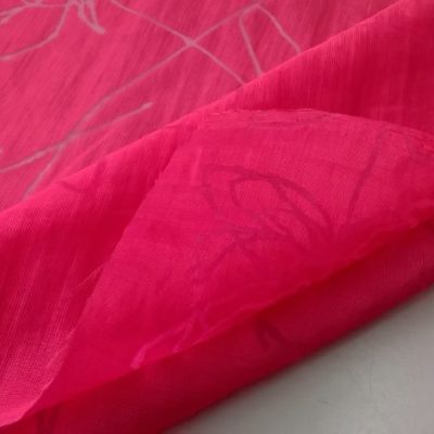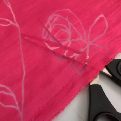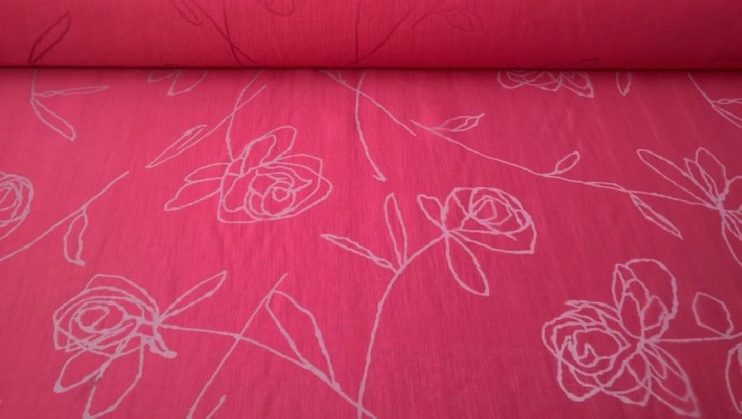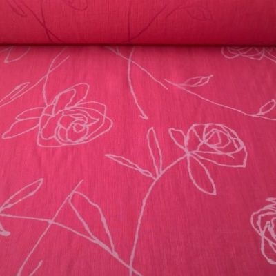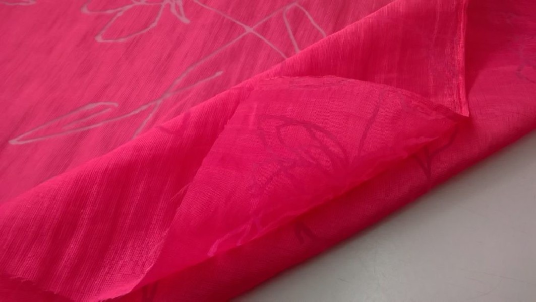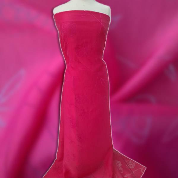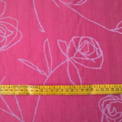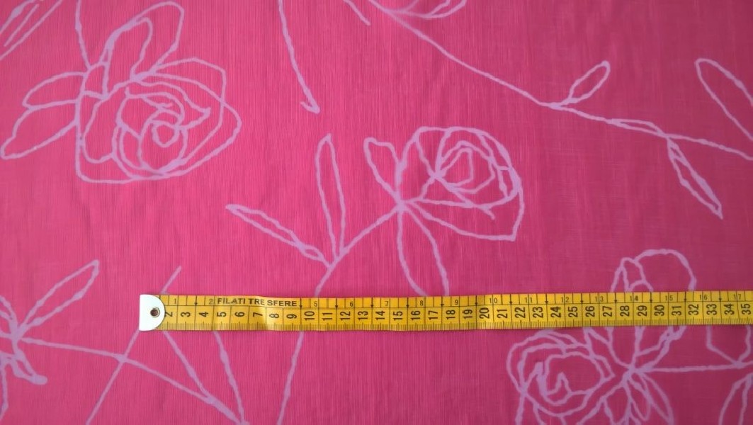 Questo tessuto incarna la raffinatezza tipica della seta, valorizzata da una fantasia floreale che si distende delicatamente su uno sfondo rosa-lilla semitrasparente.