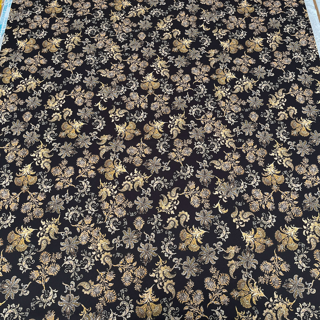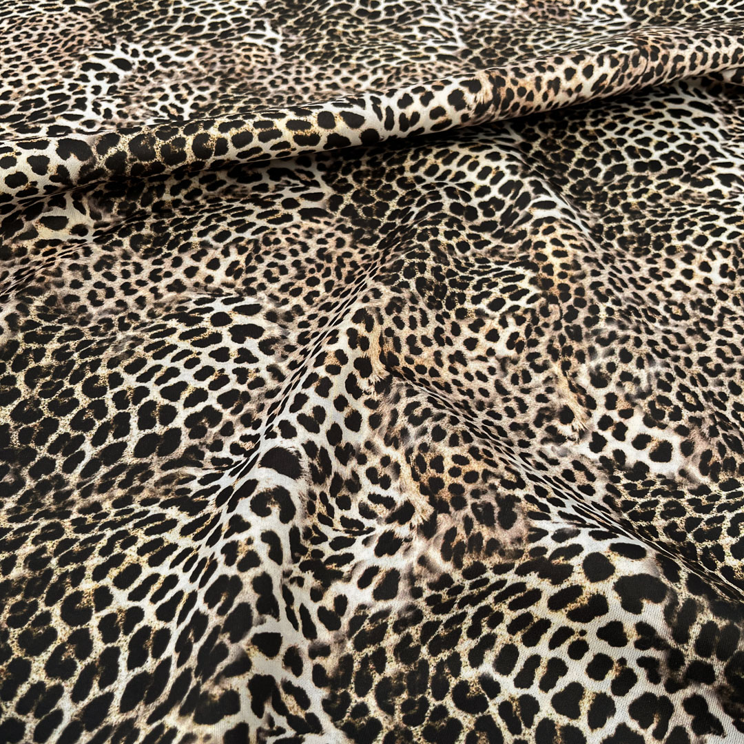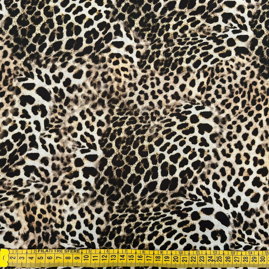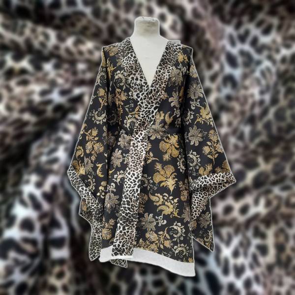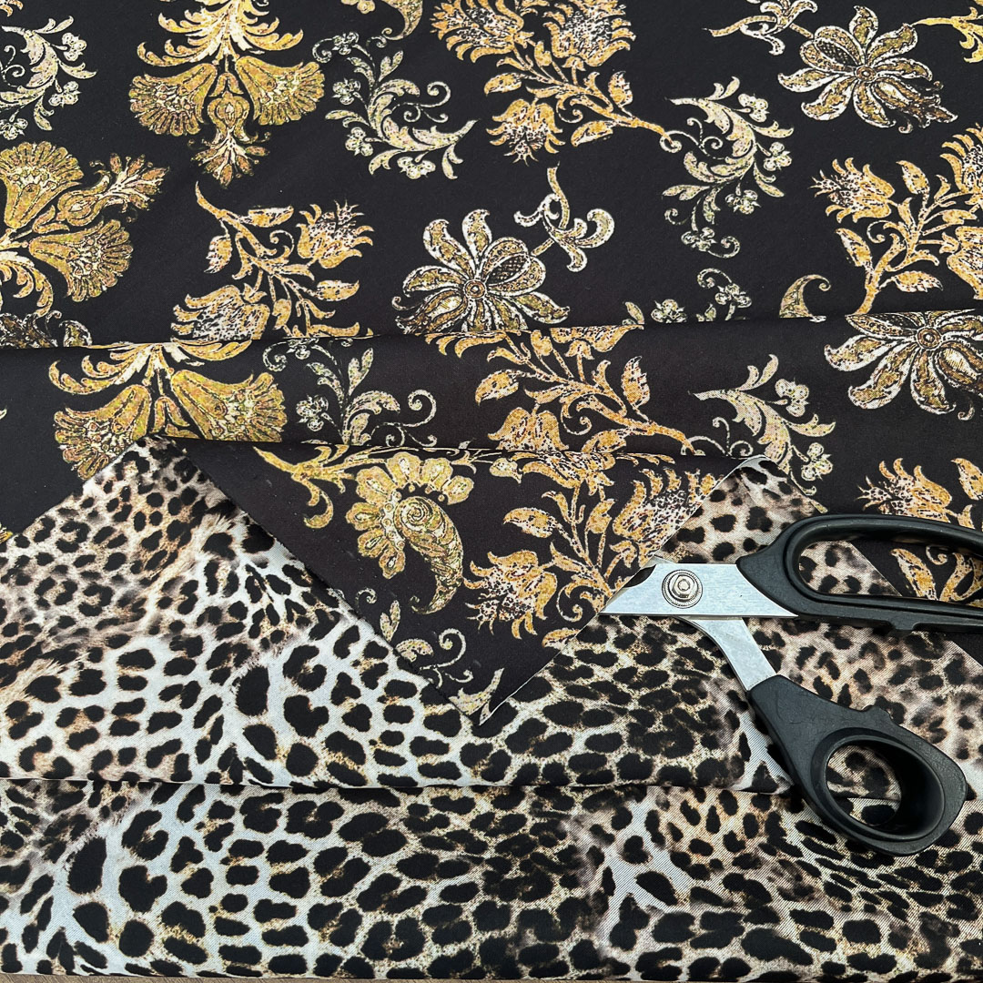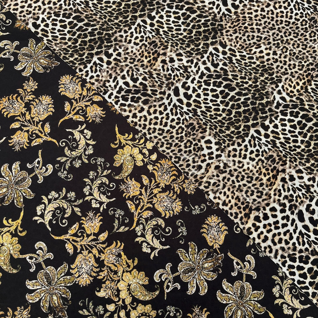 Da un lato presenta una vivace fantasia animalier leopardata, perfetta per realizzazioni audaci dallo spirito contemporaneo; dall’altro si svela un raffinato motivo damascato, elegante e ricco di dettagli, ideale per aggiungere un tocco di sofisticatezza a qualsiasi creazione.