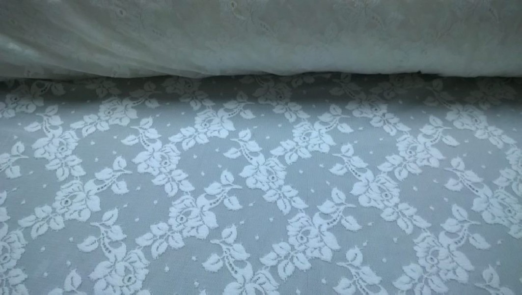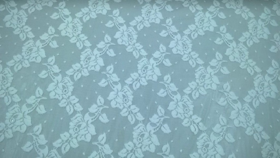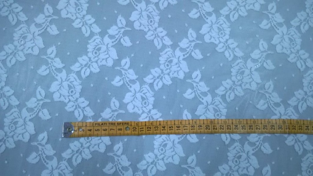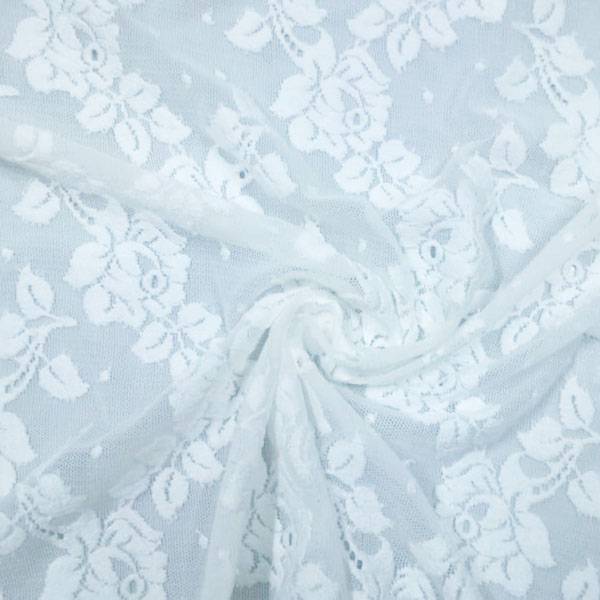 Tessuto di pizzo a rete che si distingue per la sua raffinata eleganza, caratterizzata da un delicato motivo floreale che si intreccia armoniosamente sulla superficie bianca, donando un effetto visivo leggero e sofisticato.