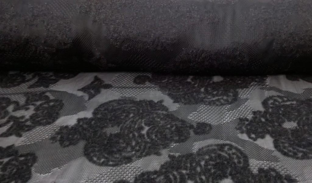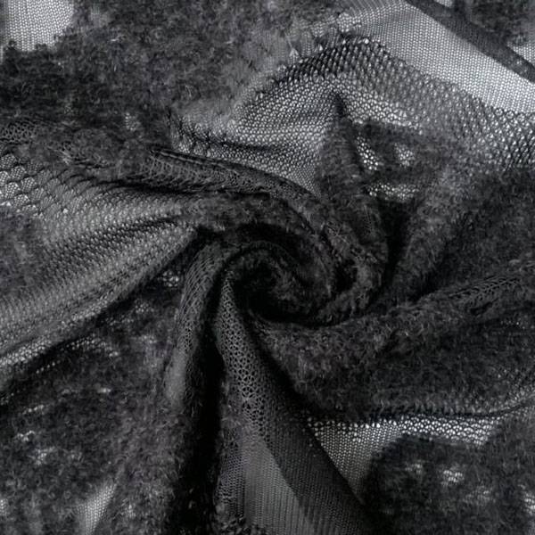 Tessuto in pizzo a rete nero con motivo in rilievo felpato