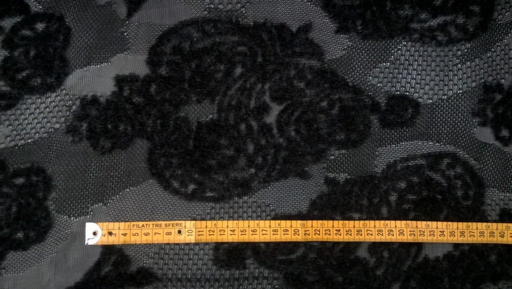 Raffinato pizzo a rete nero caratterizzato da un elegante motivo floreale in rilievo che si distingue per la sua particolare lavorazione felpata.
