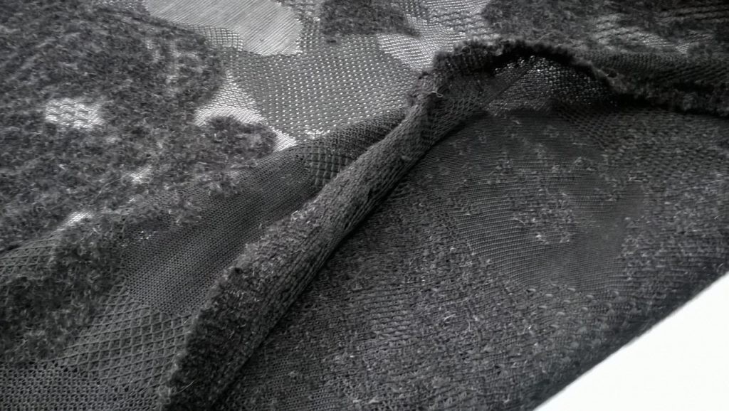 Il contrasto visivo e materico tra la trasparenza della rete e le zone felpate dona movimento e sofisticatezza, esaltando sia la ricercatezza estetica sia la versatilità d’impiego di questo tessuto.