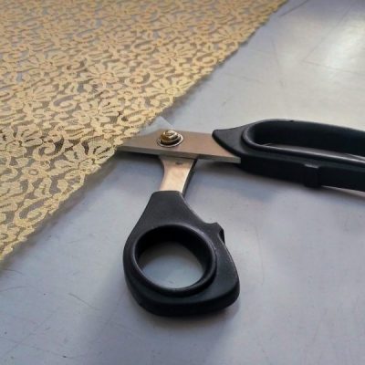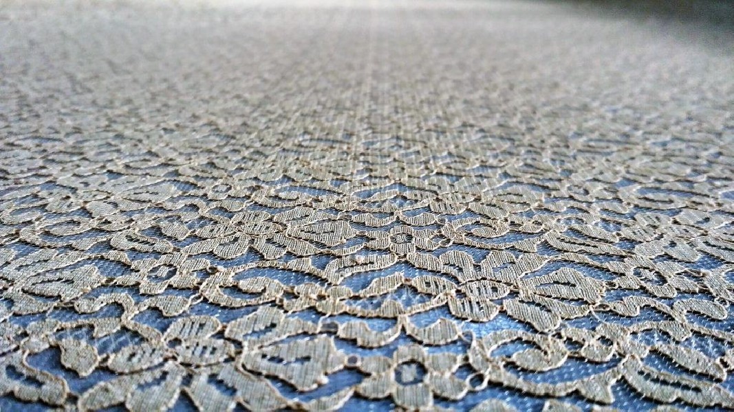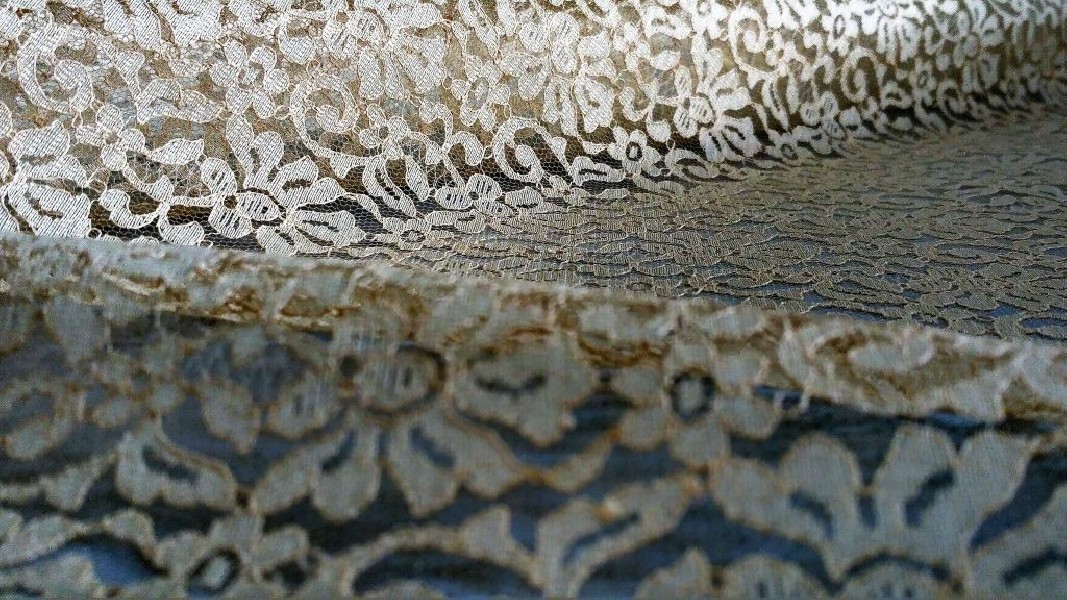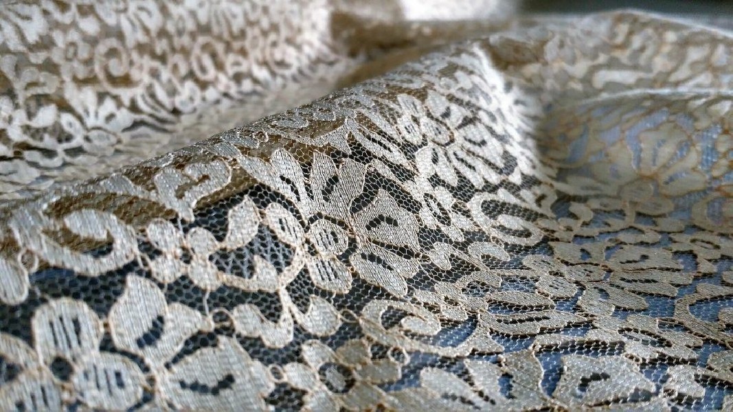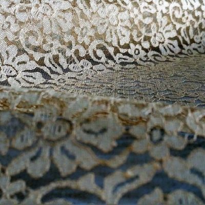 Pizzo color cipria, finissimo. Il colore e la fantasia floreale gli conferiscono un’allure rètro e shabby. Tessuto fermo.