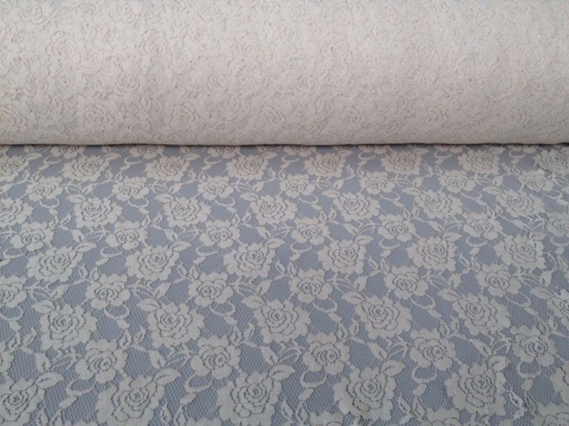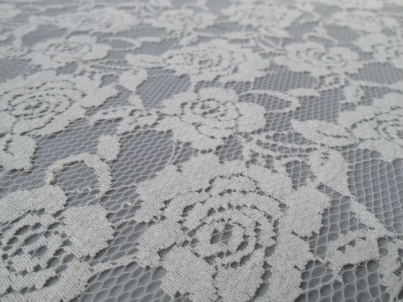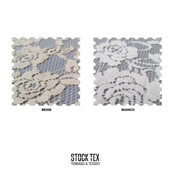 Questo pizzo presenta un motivo floreale, che conferisce al tessuto un aspetto romantico e sofisticato, spesso utilizzato in abiti eleganti, lingerie o accessori.