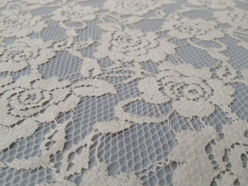 La stoffa è caratterizzata da una trama di pizzo in cotone, che è un materiale decorativo composto da una rete di fili intrecciati e che presenta un’ottima morbidezza ed elasticità.