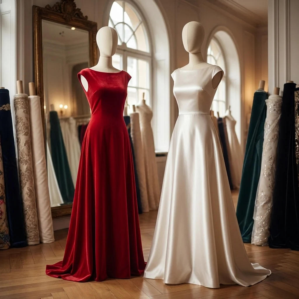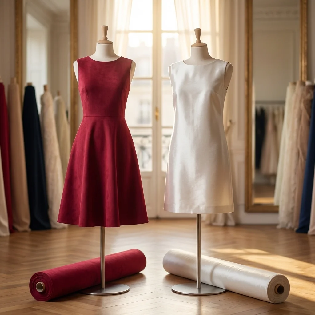 Entrambe le versioni hanno una superficie liscia e compatta, con una lucentezza setosa che crea morbidi giochi di luce al movimento, senza motivi o disegni stampati, ma con le tipiche vibrazioni naturali della trama che rendono il fondo vivo e sofisticato. La mano è scivolata e fluida, con una caduta morbida che avvolge la figura senza appesantirla, perfetta per capi che richiedono eleganza e comfort a contatto con la pelle.