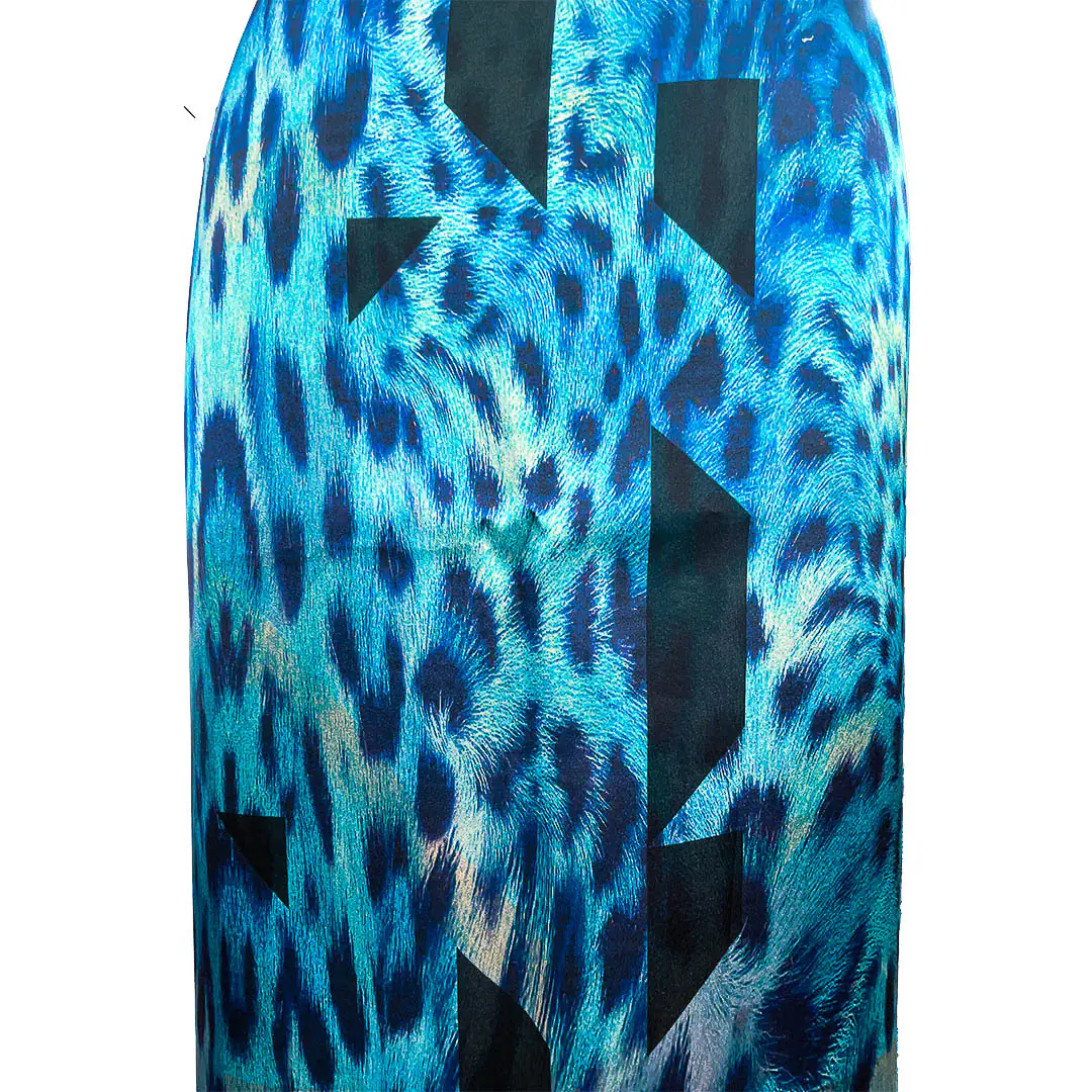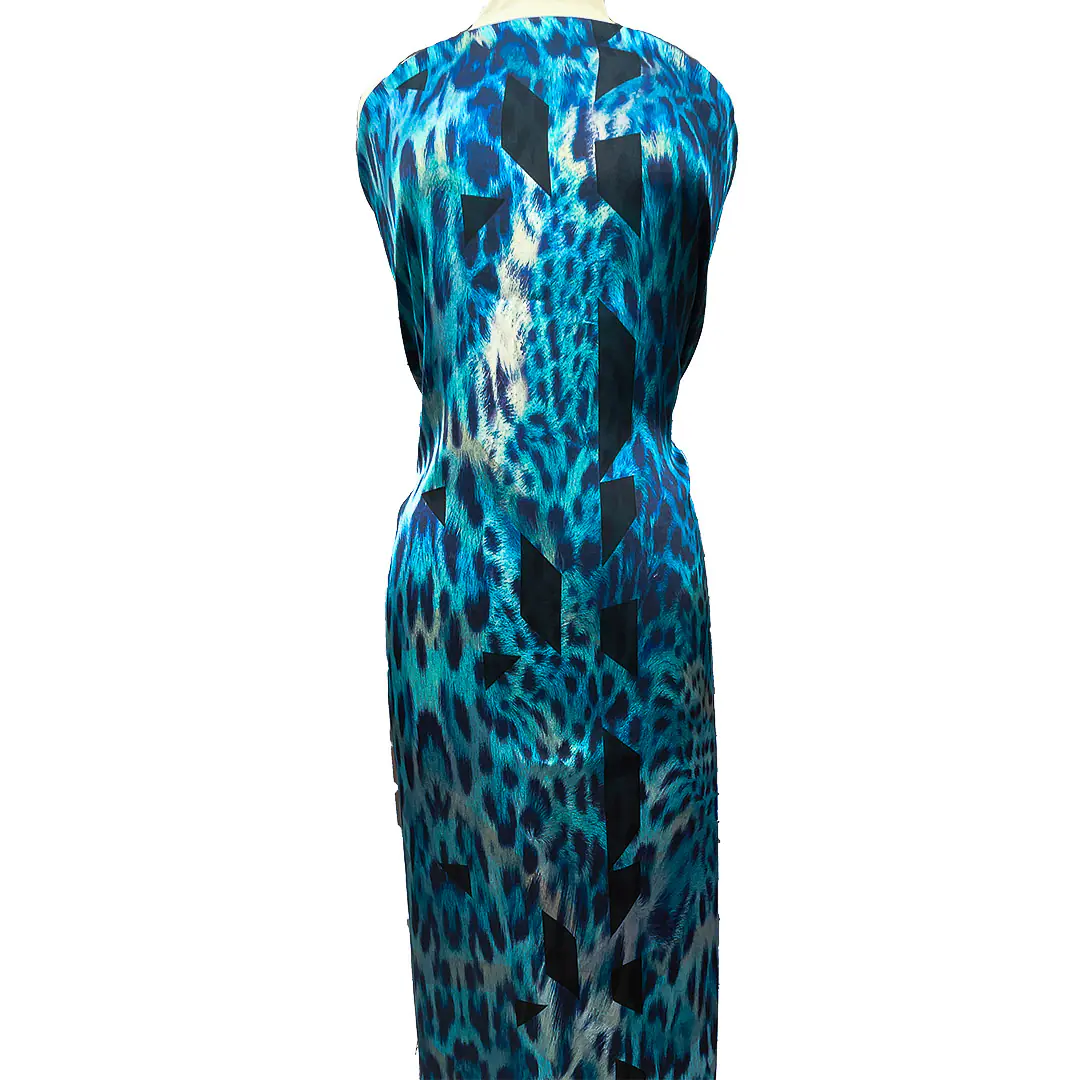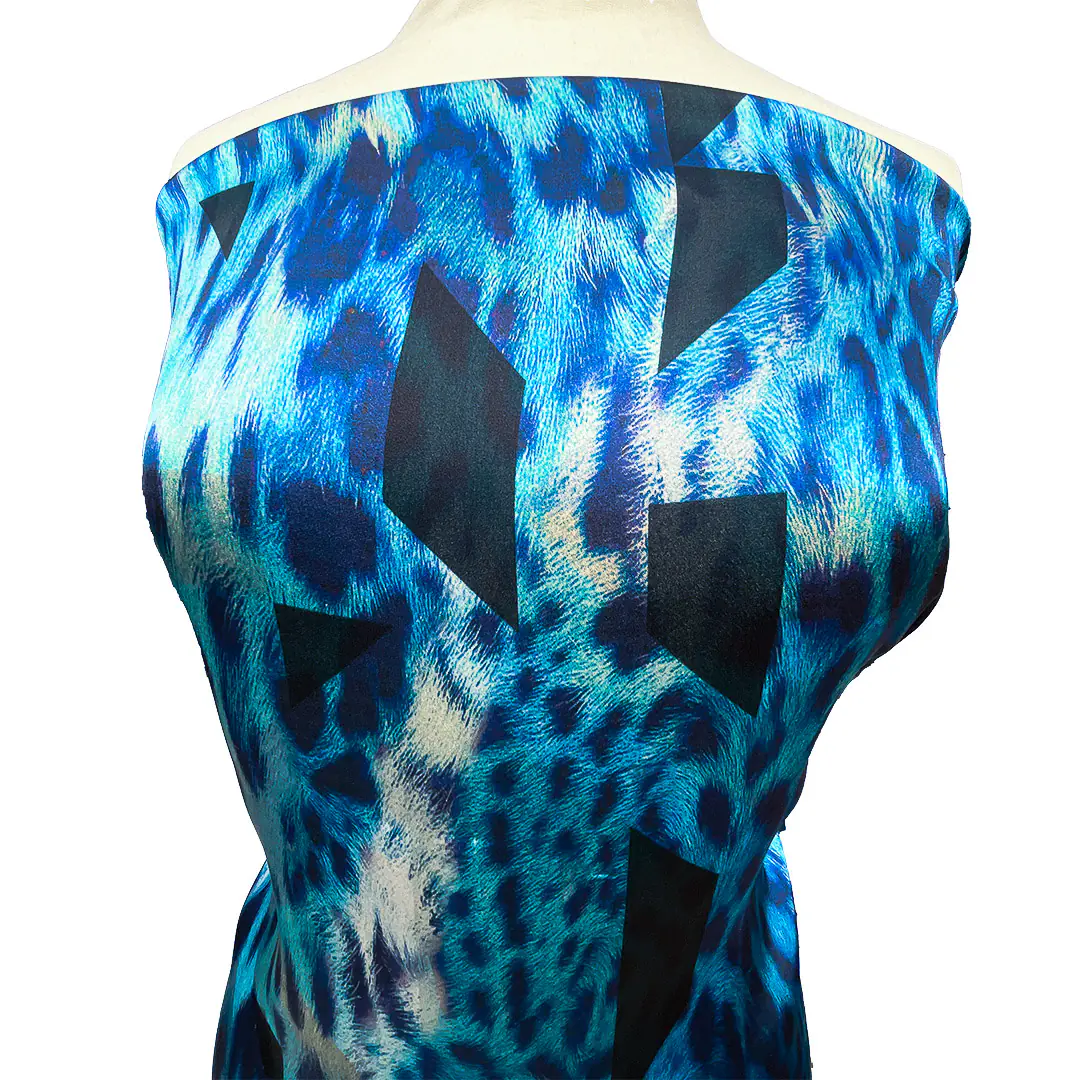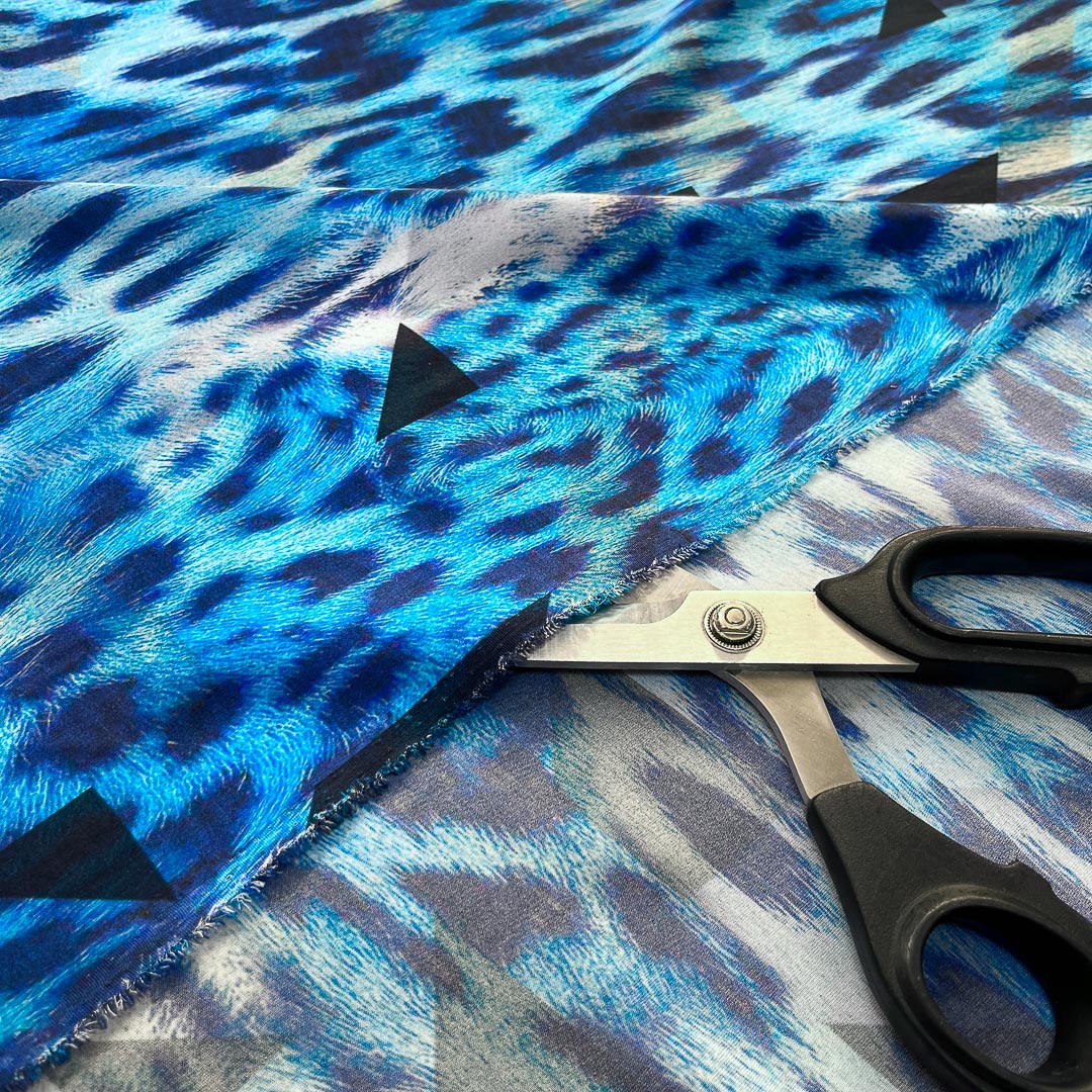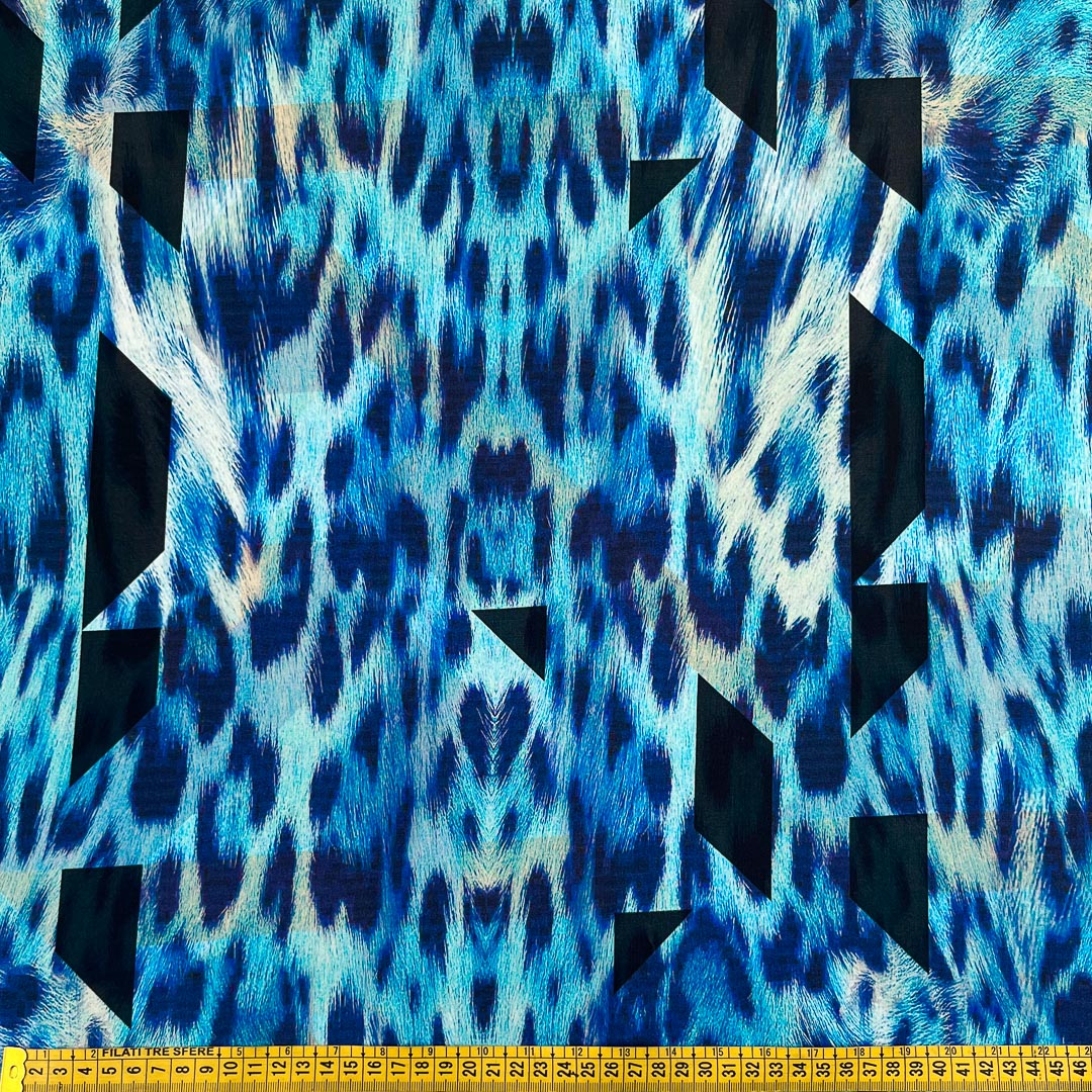 Ricco di varie sfumature di blu ed a contrasto motivi geometrici e maculati di un nero deciso, dalla sensazione morbida al tatto e dalla buona vestibilità.