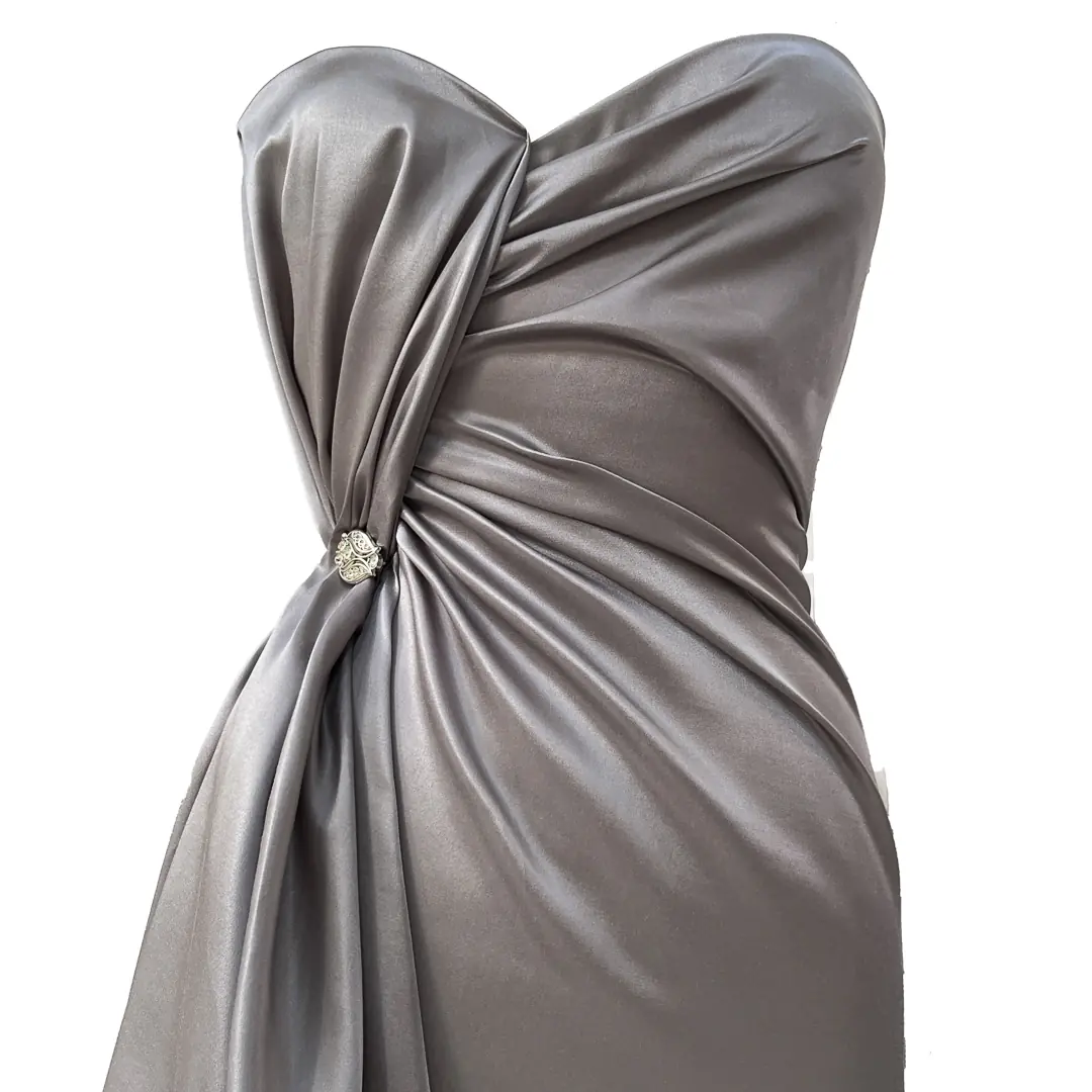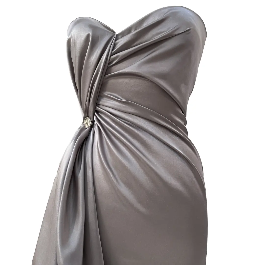 Il colore del tessuto in raso di seta è un raffinato grigio canna di fucile, una tonalità intensa e moderna che si presta a molteplici interpretazioni stilistiche.
