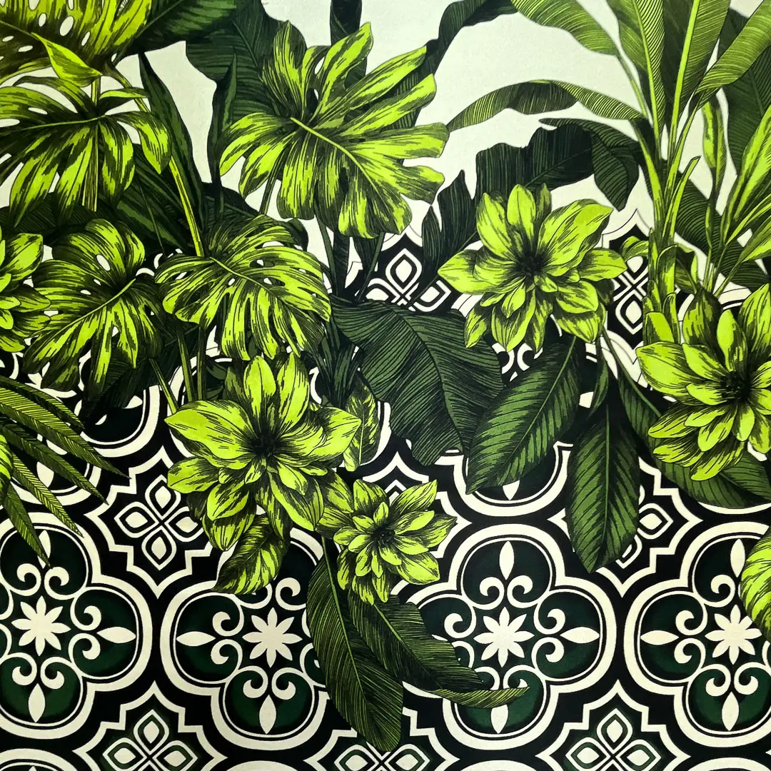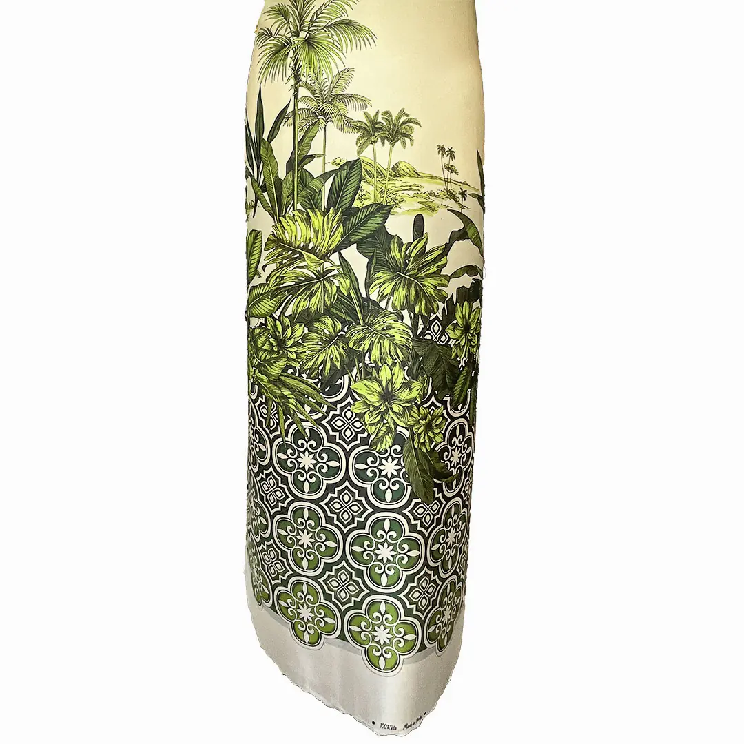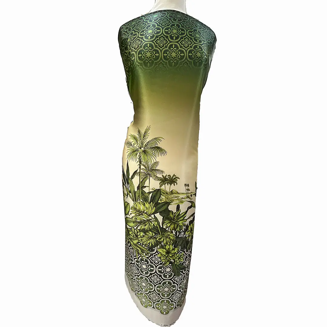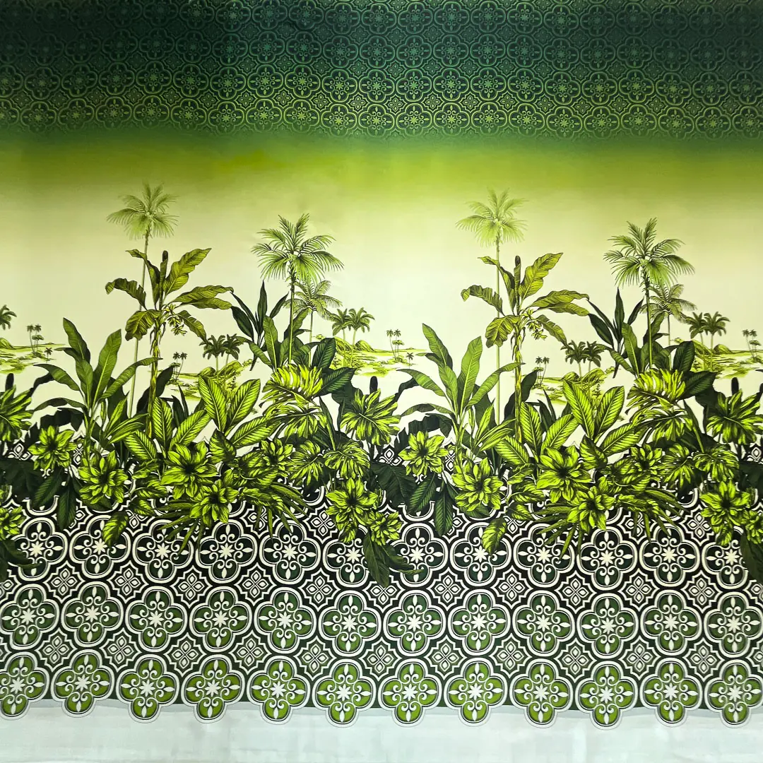 La stampa, con le sue palme e le sue foglie, evoca atmosfere esotiche e rilassanti, mentre la sfumatura di colore dal verde intenso al beige aggiunge profondità e dinamismo al disegno.