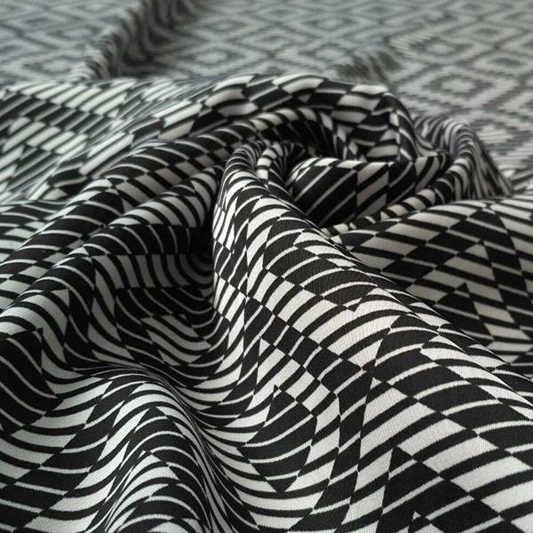 Questo tessuto si presenta leggero, liscio e coprente. La fantasia geometrica copre tutta l’altezza ed è composta da rombi e righe. Questo raso di color nero intenso e bianco ottico è un evergreen che non Può mancare nel vostro armadio. Ideale per creare gonne, pantaloni, camicie, bluse e abiti.