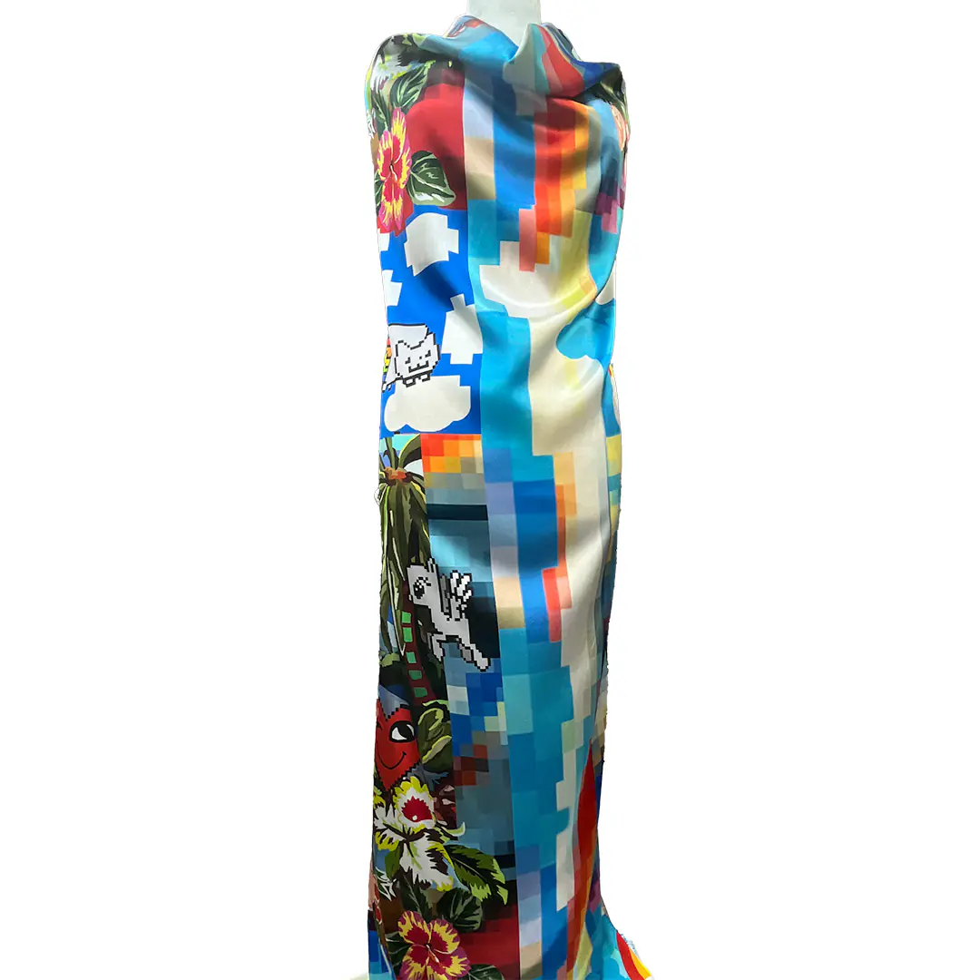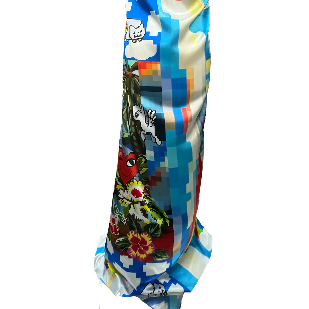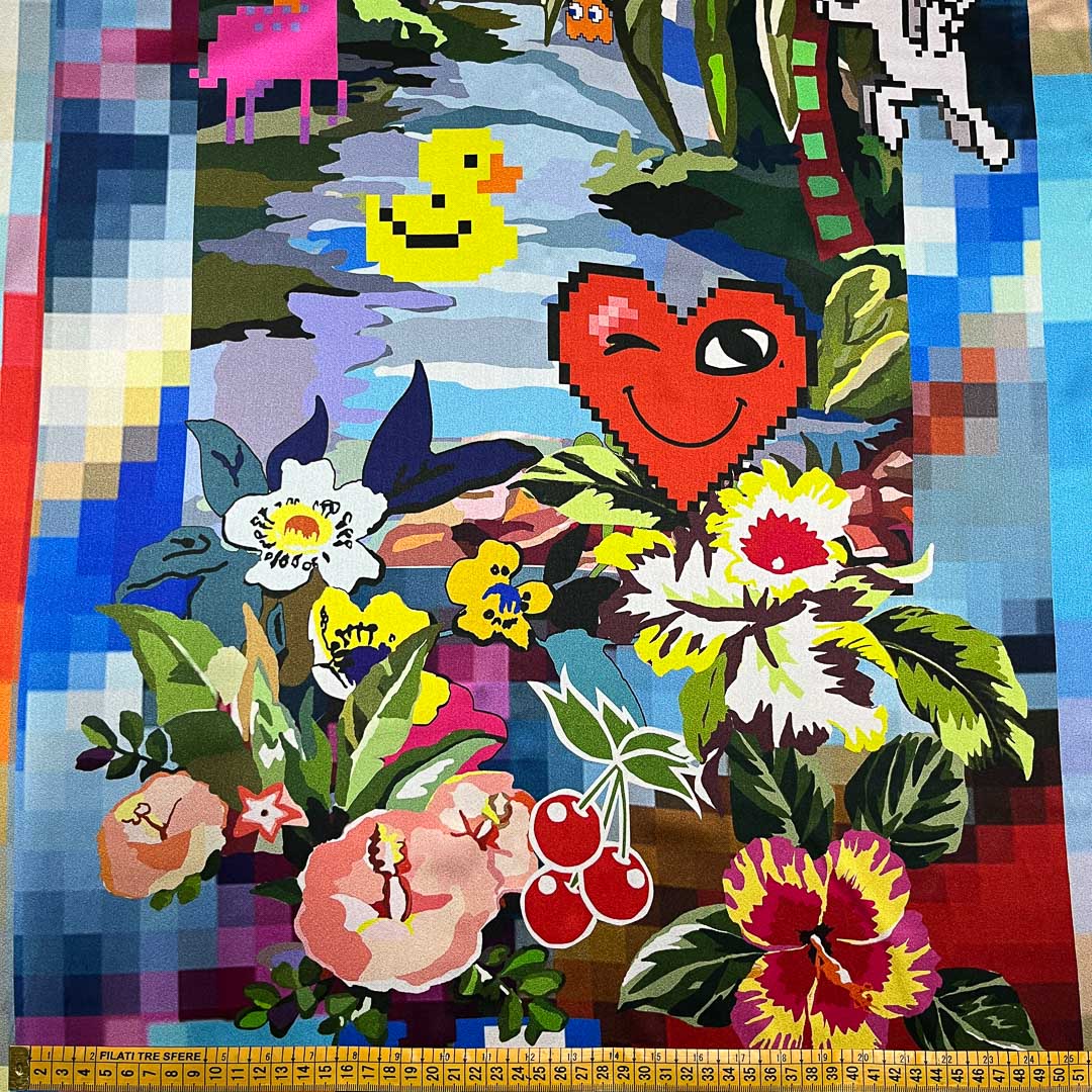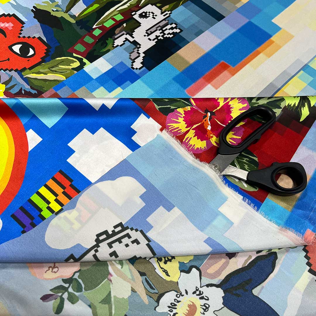 Il raso di seta elasticizzato con fantasia pop è un tessuto innovativo e divertente, che unisce l’eleganza della seta alla creatività di un design giovane e frizzante.