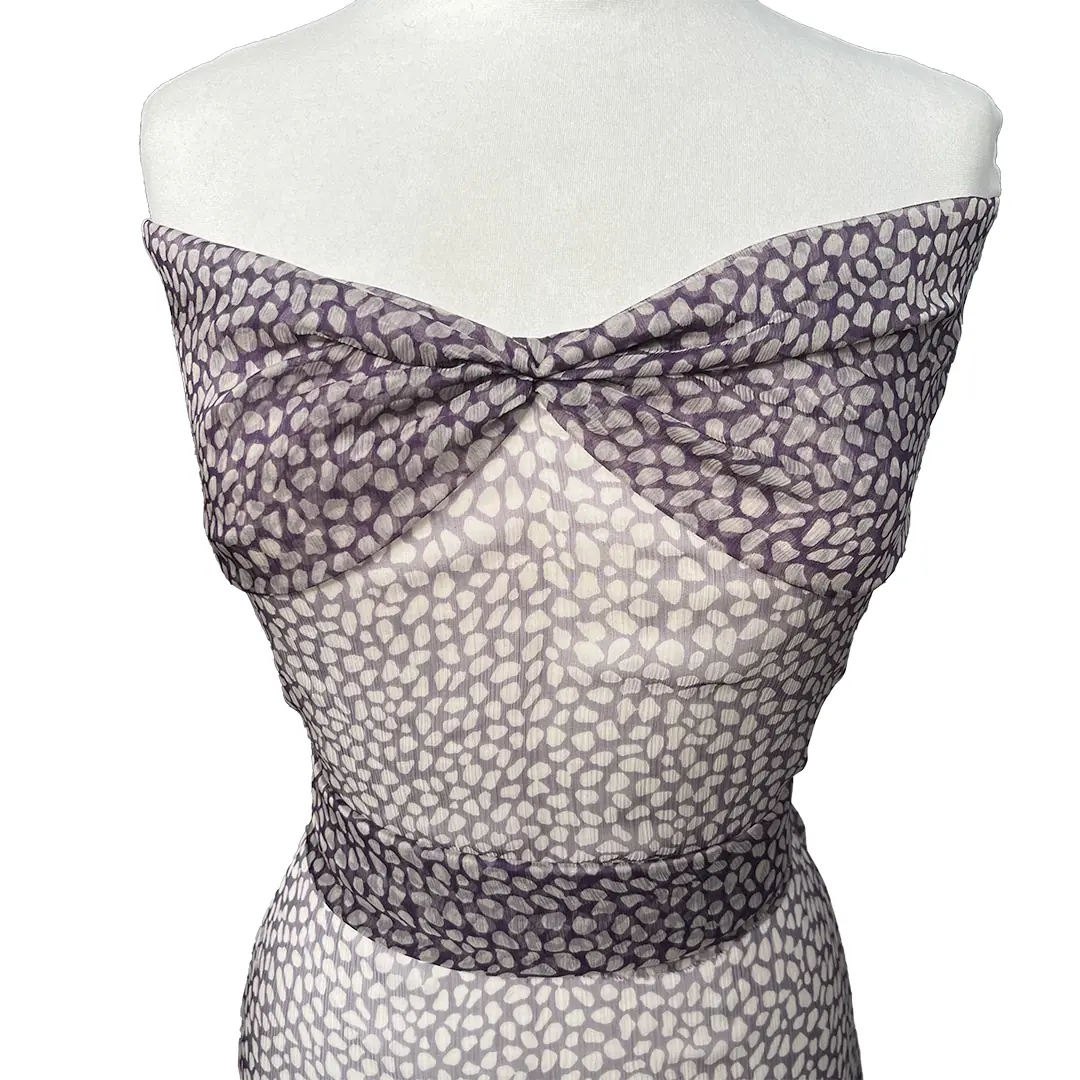La sua texture goffrata aggiunge un elemento di interesse visivo e tattile, mentre il chiffon conferisce un fluire delicato e un movimento grazioso ai capi realizzati.