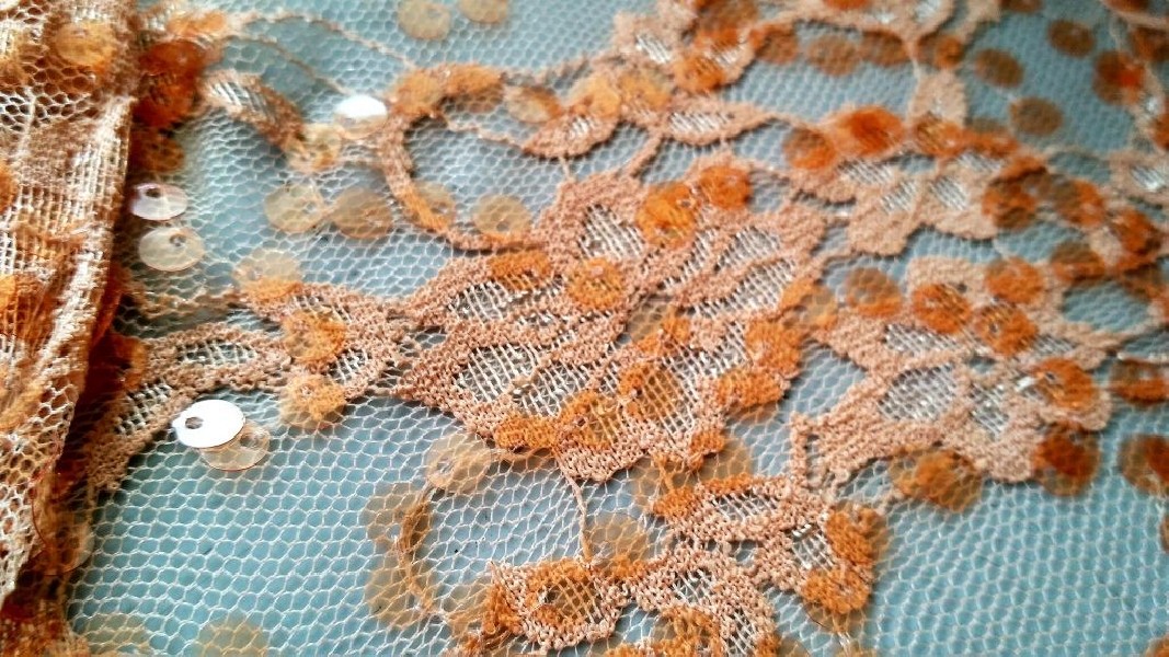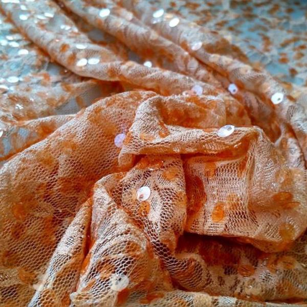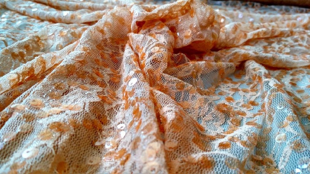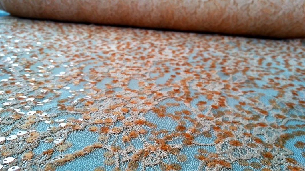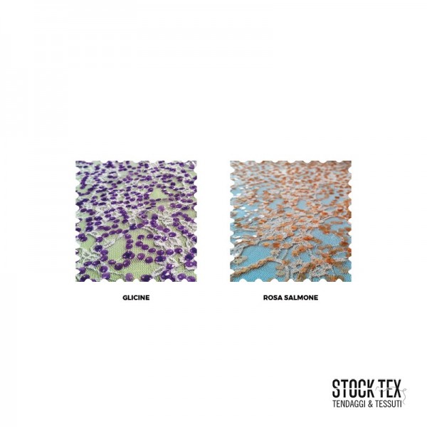 Elegante tessuto in tulle elasticizzato con fantasia floreale e una morbida cascata di paillettes in leggero rilievo