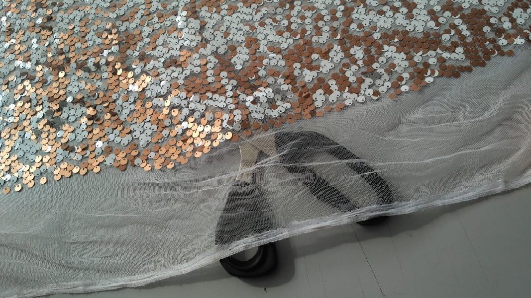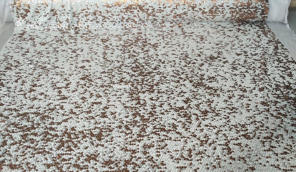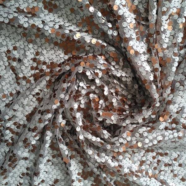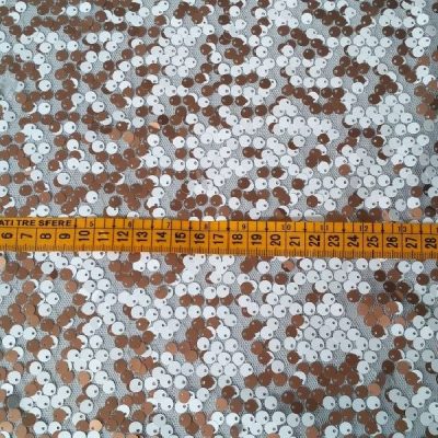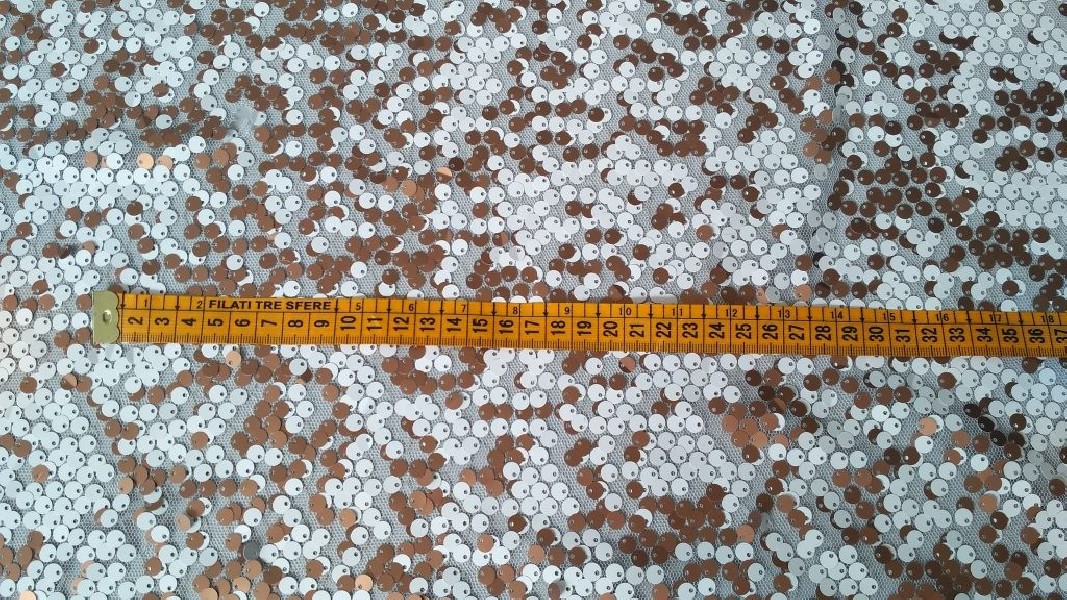 Tessuto in morbido tulle rivestito di paillettes bianche e rame brillante.