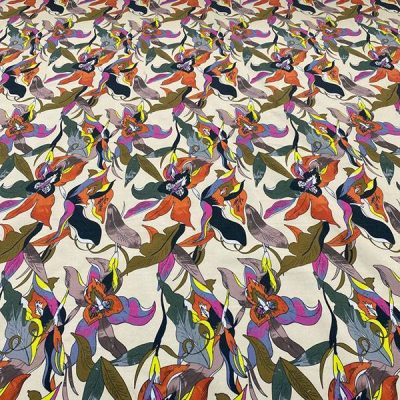 Prezioso tessuto cosparso di fiori dai mille colori, un gioco di contrasti che lo rende unico e particolare.