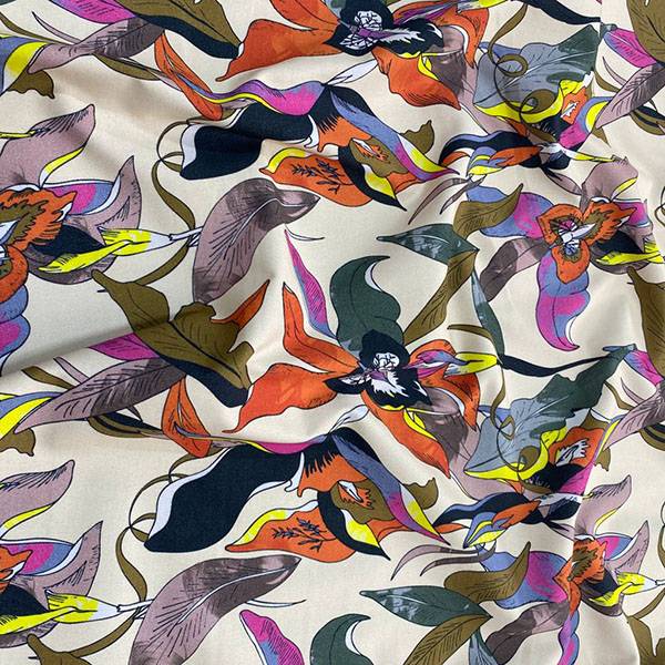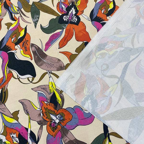 Caratterizzato da una fantasia floreale dalle tonalità calde su uno sfondo color pesca chiaro.