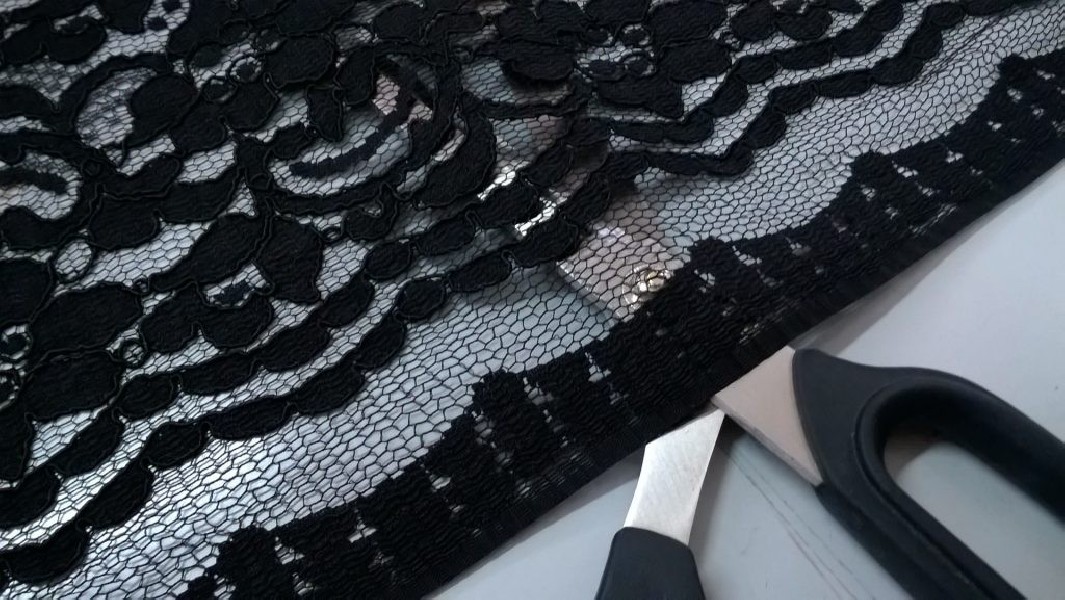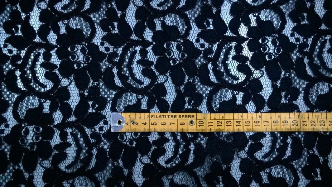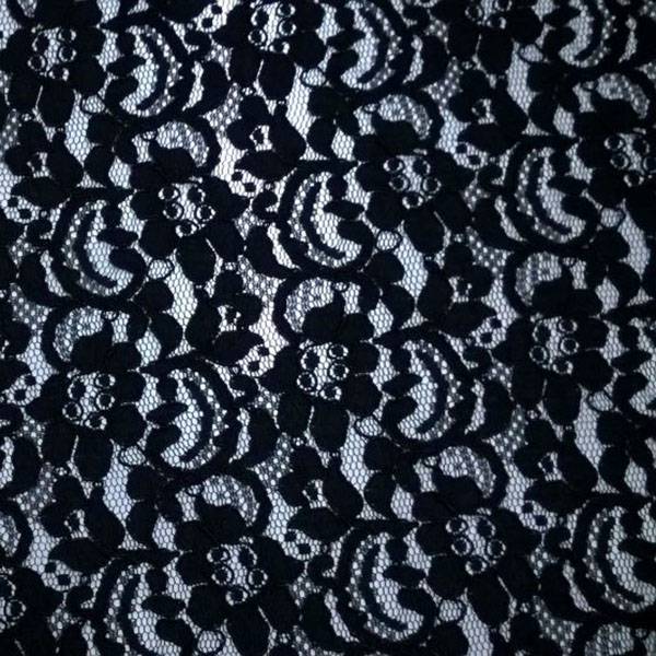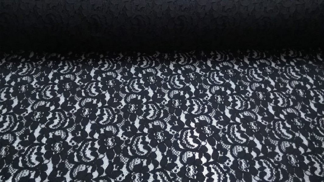 Pizzo nero di alta qualità, caratterizzato da una lavorazione a rete trasparente su cui si sviluppa una complessa fantasia floreale.