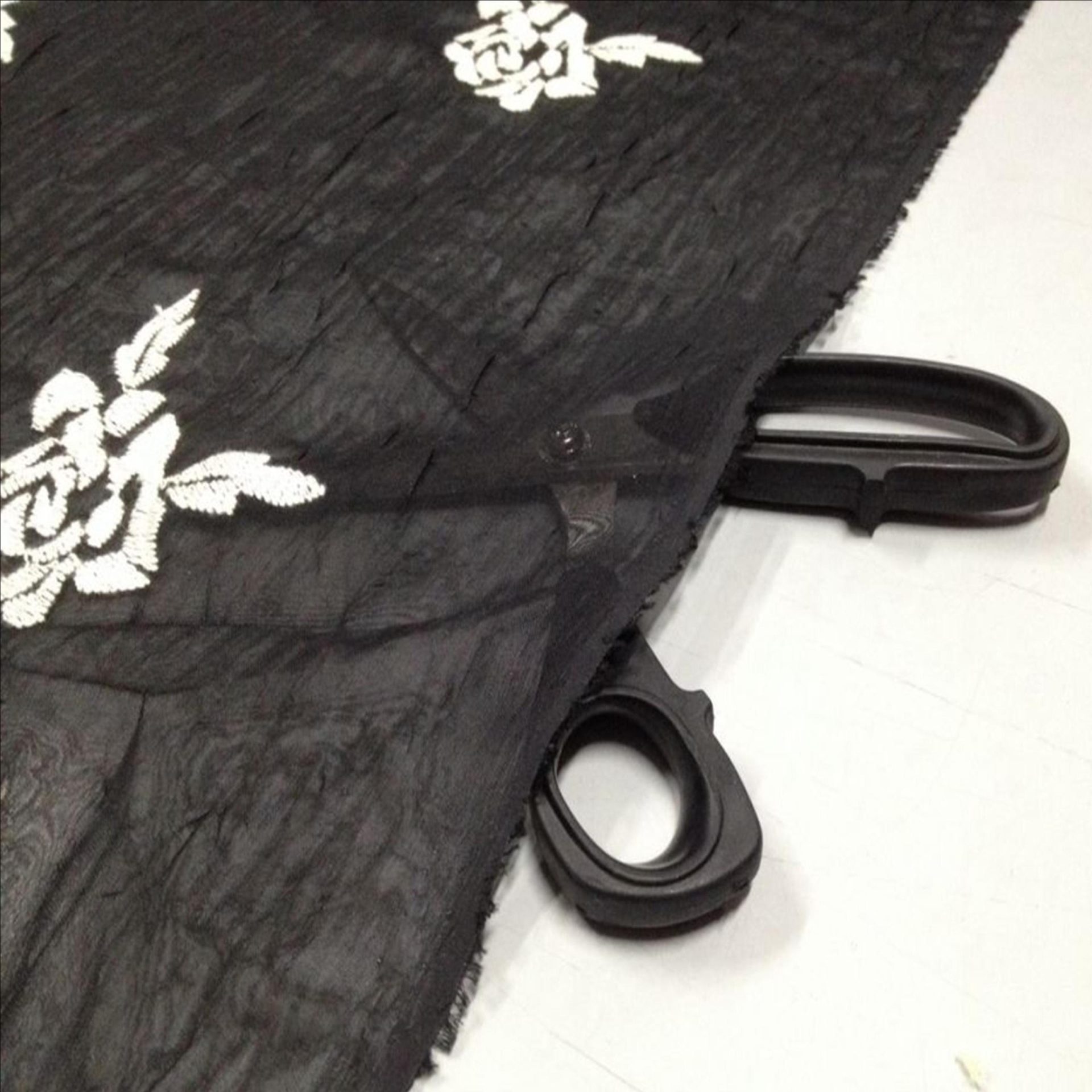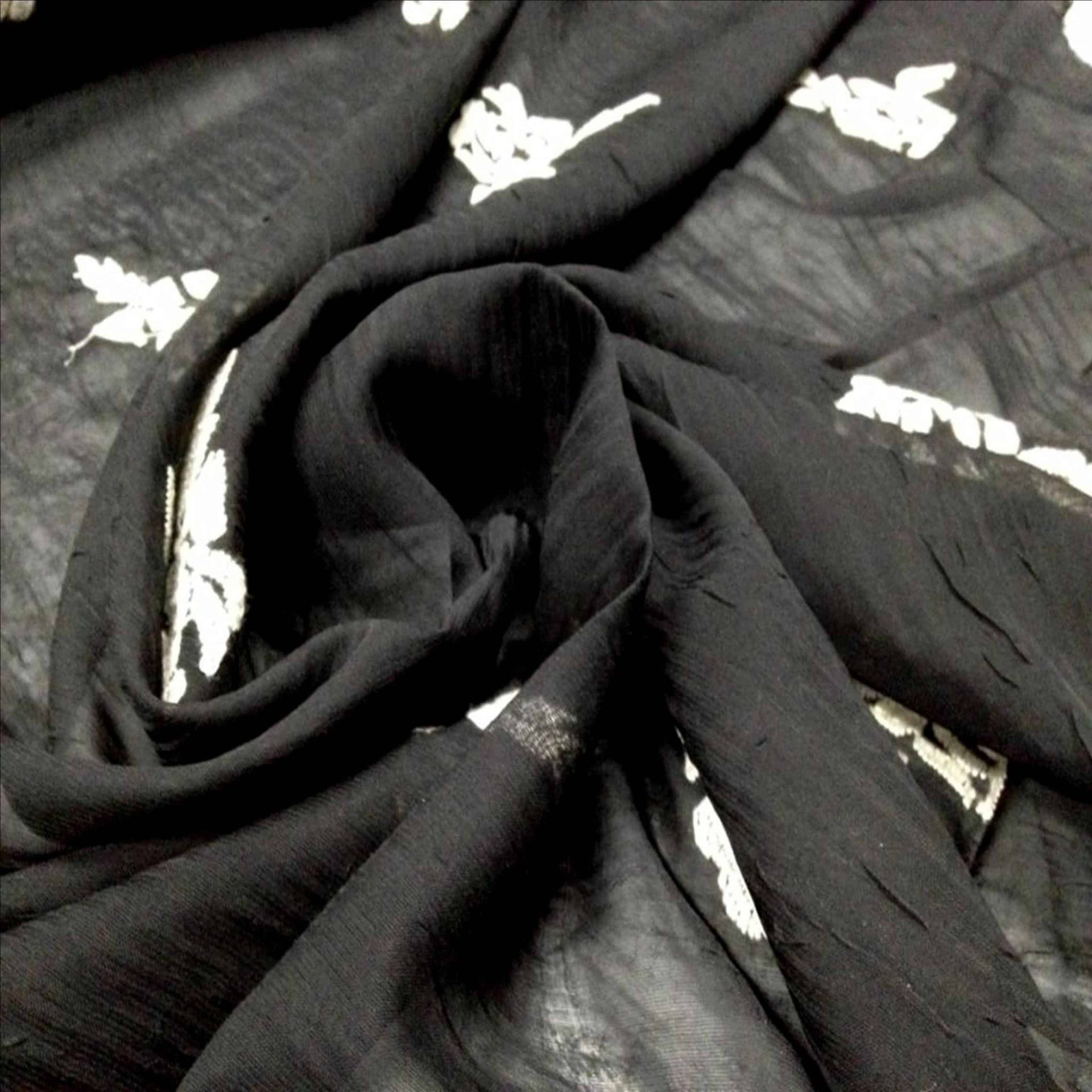 Elegantissimo tessuto nero semitrasparente con rose bianche ricamate