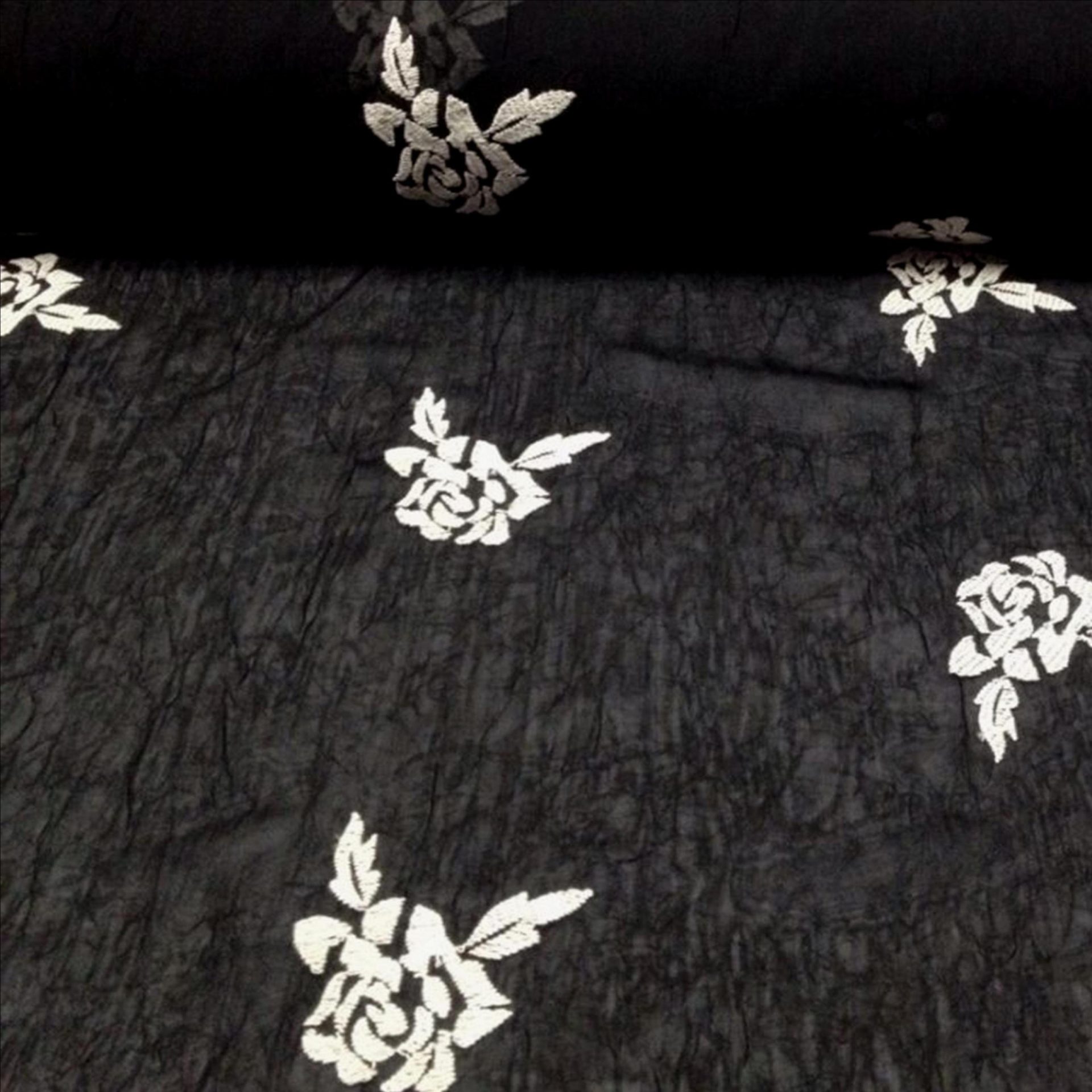 Questo tessuto colpisce immediatamente per la sua eleganza e raffinatezza, grazie alla particolare combinazione di un fondo nero semitrasparente e lussuose rose bianche ricamate che lo decorano con gusto e delicatezza.