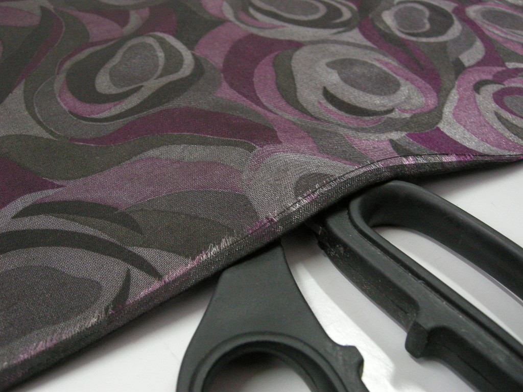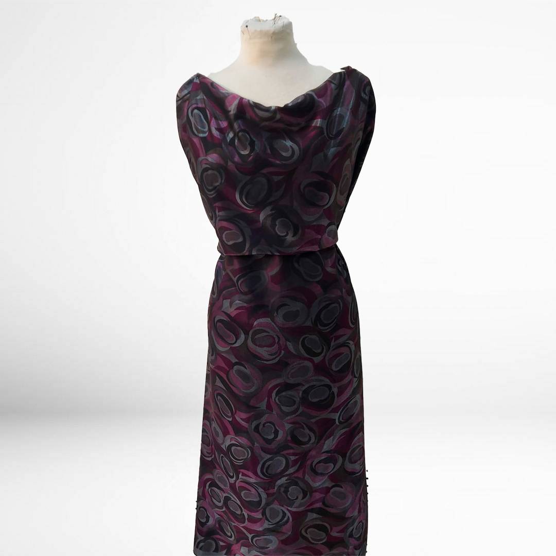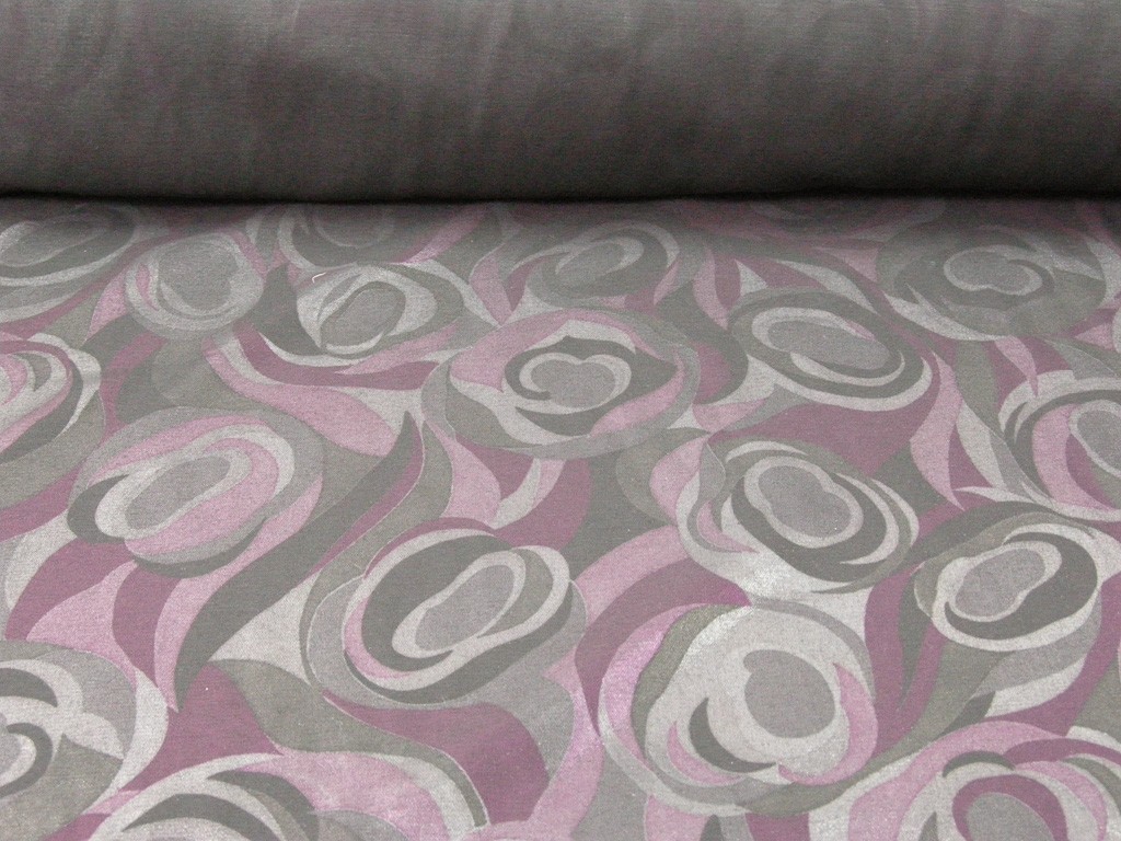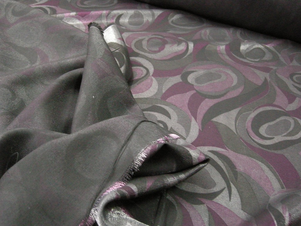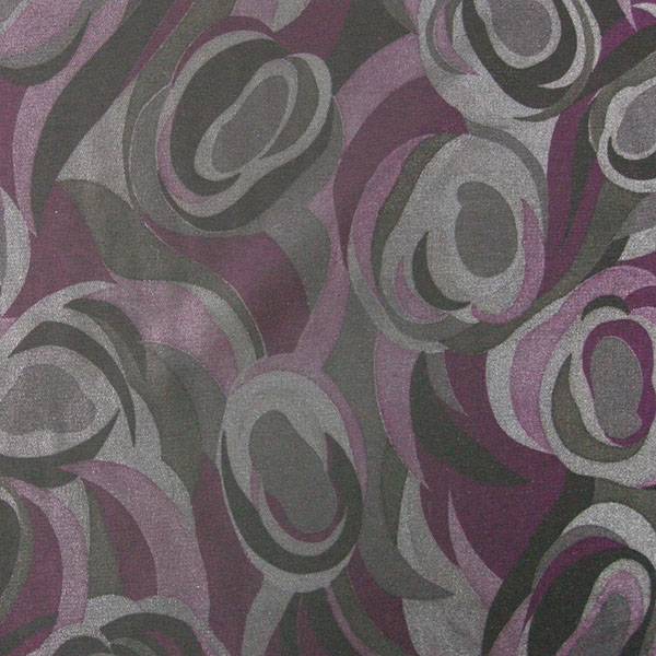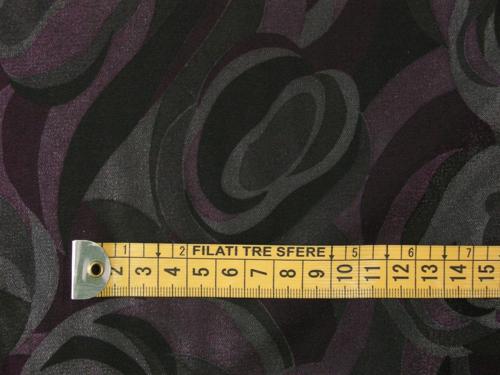 La stoffa si distingue per una composizione cromatica ricca e profonda, con tonalità scure di viola, fucsia e grigio che si intrecciano attraverso un disegno astratto a onde e curve dinamiche.