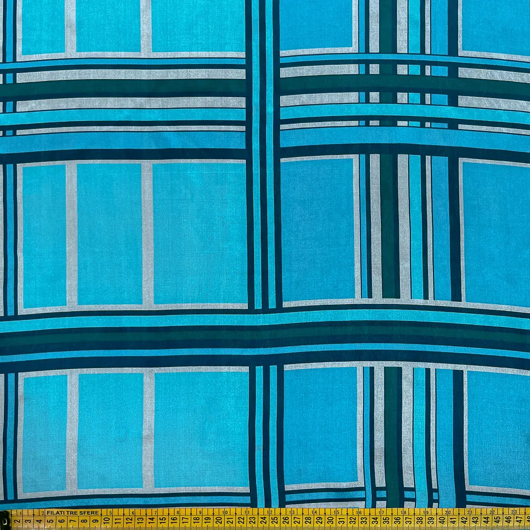 Il colore dominante di questo tessuto in pura seta al metraggio è un azzurro luminoso e arioso, che evoca la freschezza e la serenità. Su questo sfondo, si stagliano le righe, declinate in una palette di colori delicata e armoniosa: il bianco candido, simbolo di purezza e luminosità, il celeste tenue, che richiama la limpidezza del cielo, e il verde acqua scuro, una nuance inaspettata e originale, che conferisce un tocco di profondità e mistero.