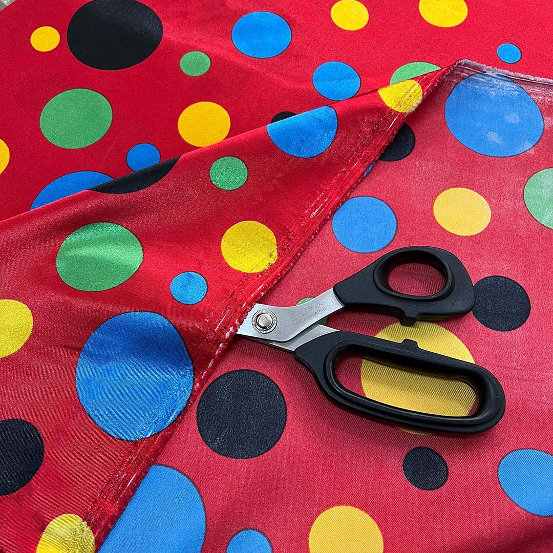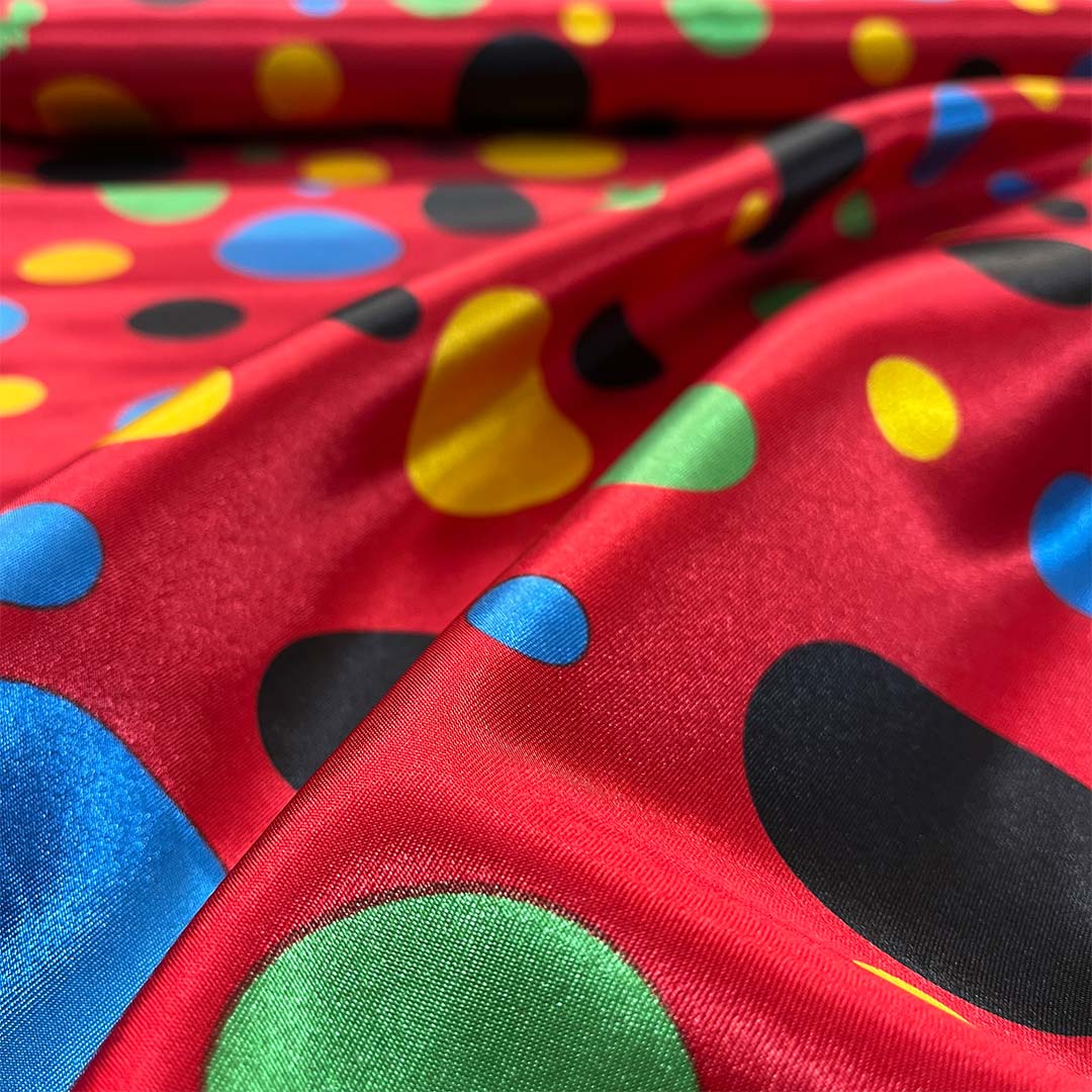 Tessuto raso motivo a pois colorati su sfondo rosso