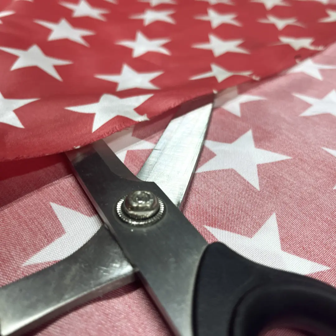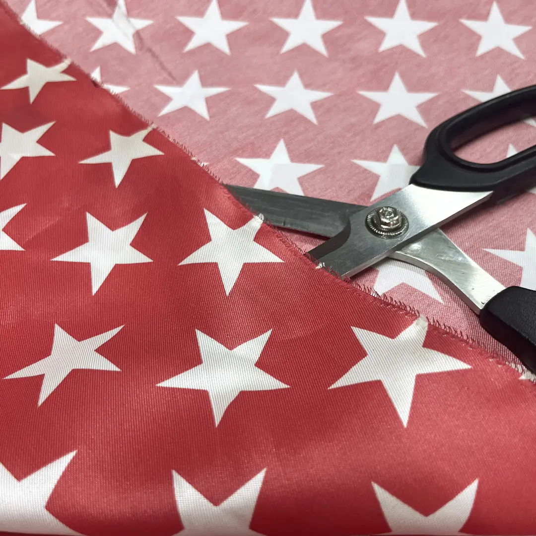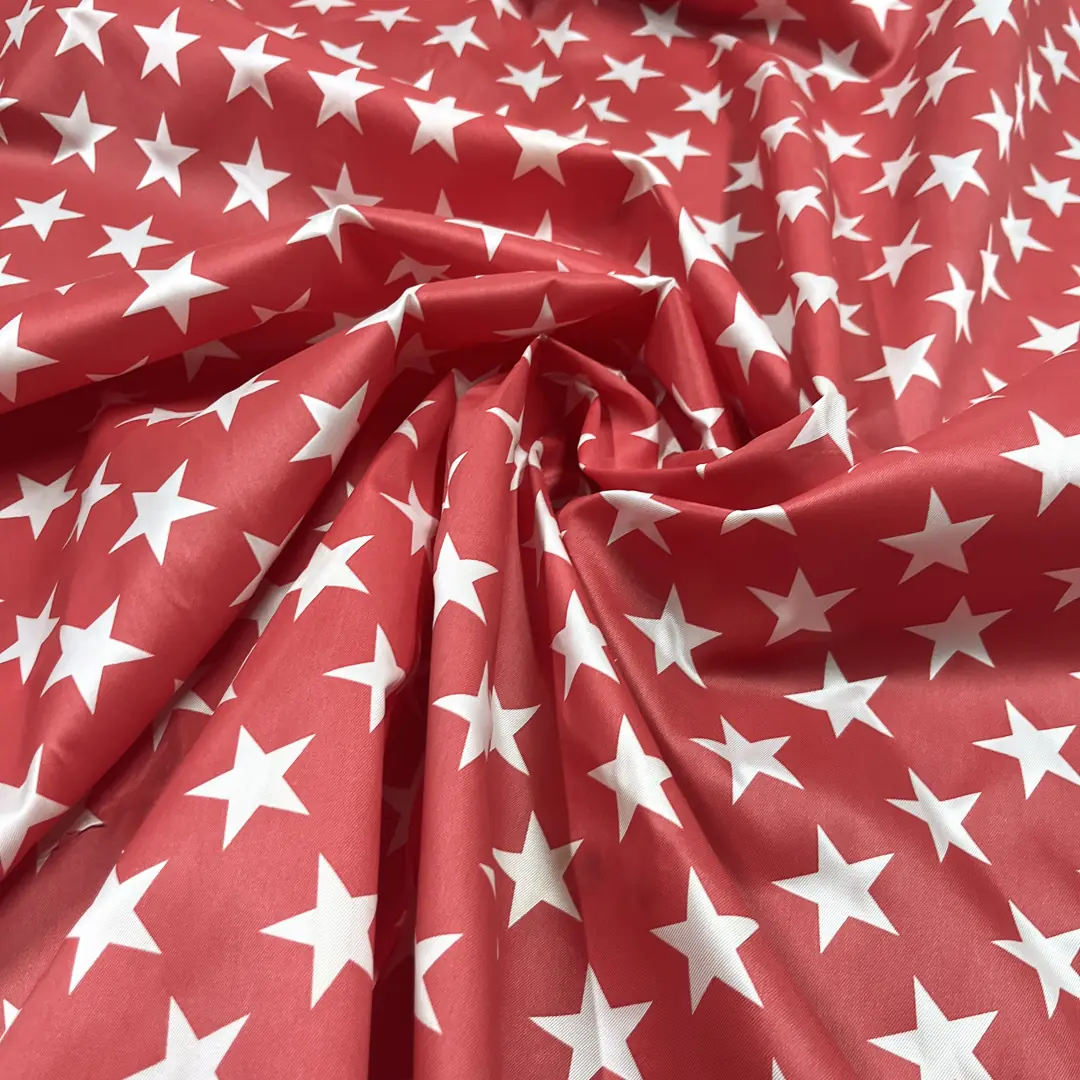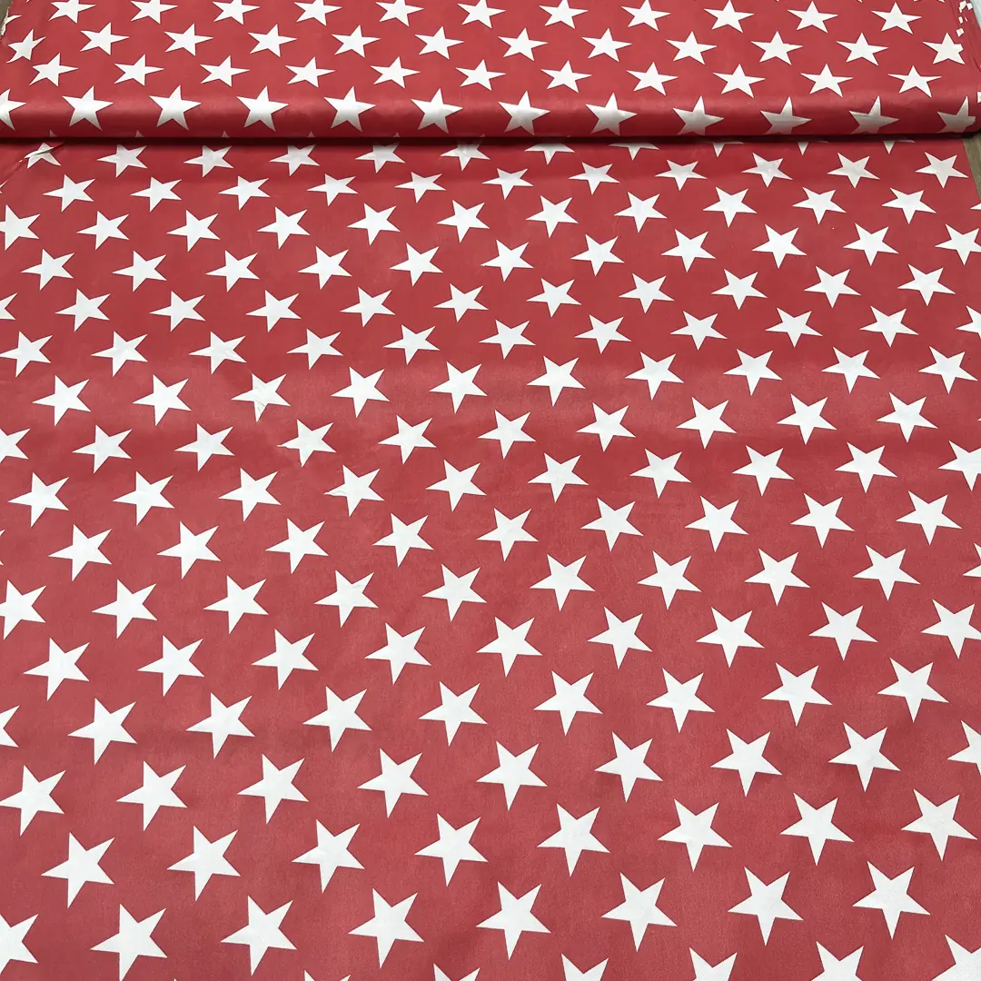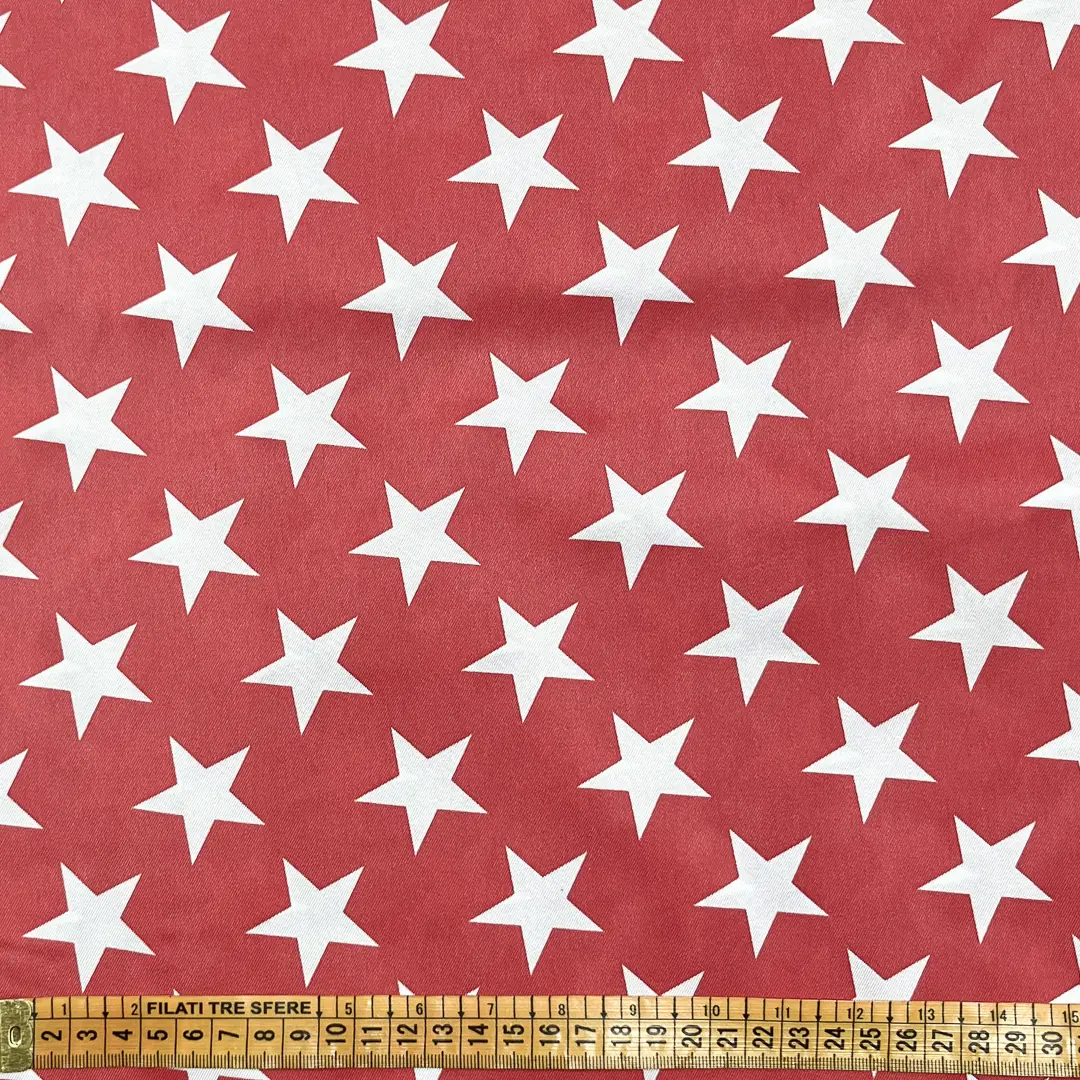 Raso stampato con stelle bianche su sfondo rosso, ideale per realizzare fantastici costumi