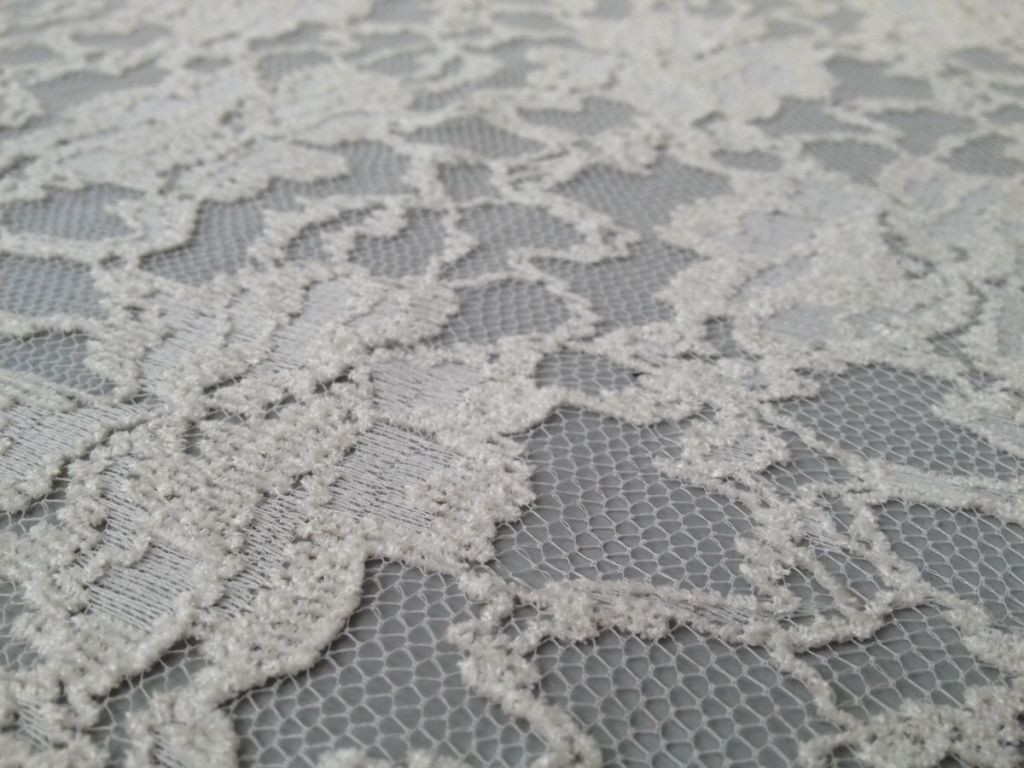 Questo pizzo presenta un motivo floreale, che conferisce al tessuto un aspetto romantico e sofisticato, spesso utilizzato in abiti eleganti, lingerie o accessori.