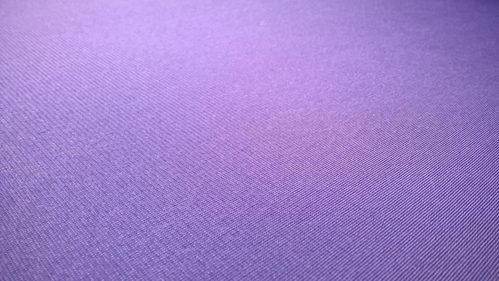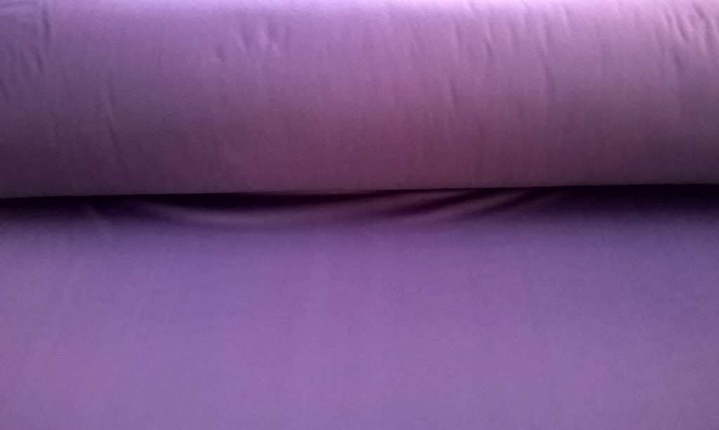 Il tessuto in poliestere simil maglina dal vivace tono viola, la cui superficie presenta una mano liscia e leggermente lucida che richiama la fluidità tipica delle magline elasticizzate.