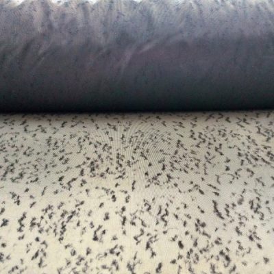 Alla vista e al tatto trasmette una sensazione di impalpabilità, grazie alla sua struttura sottile e delicata, mentre la superficie è arricchita da un raffinato motivo floccato nero che richiama sfumature animalier in chiave stilizzata.