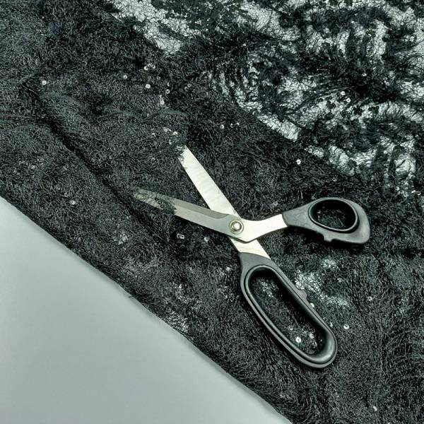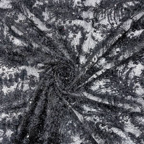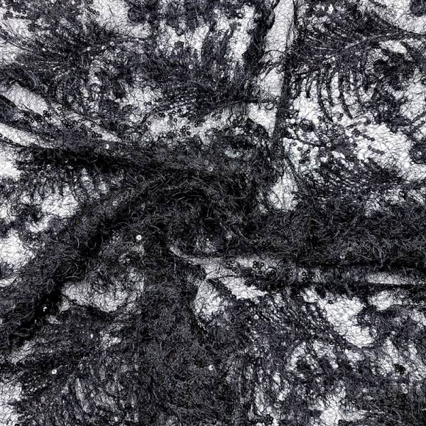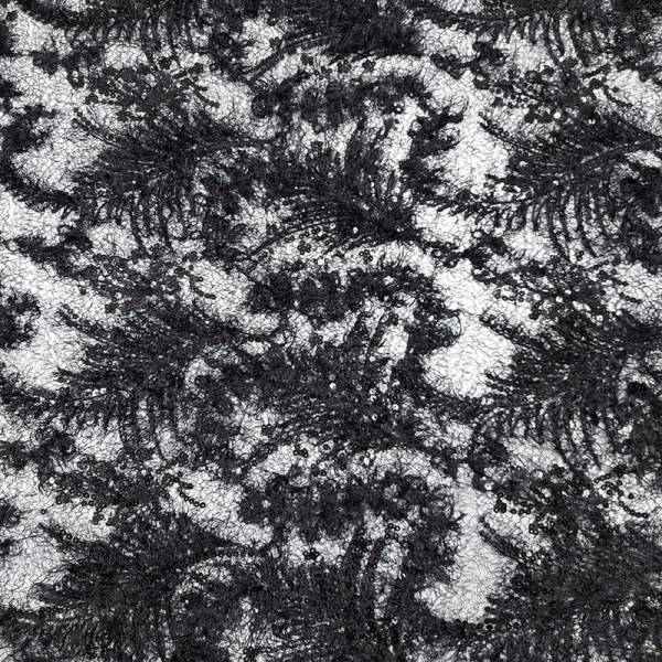 Tessuto in pizzo di colore nero su rete trasparente.