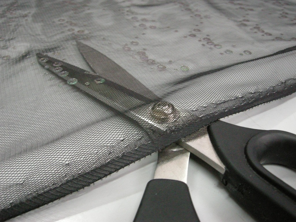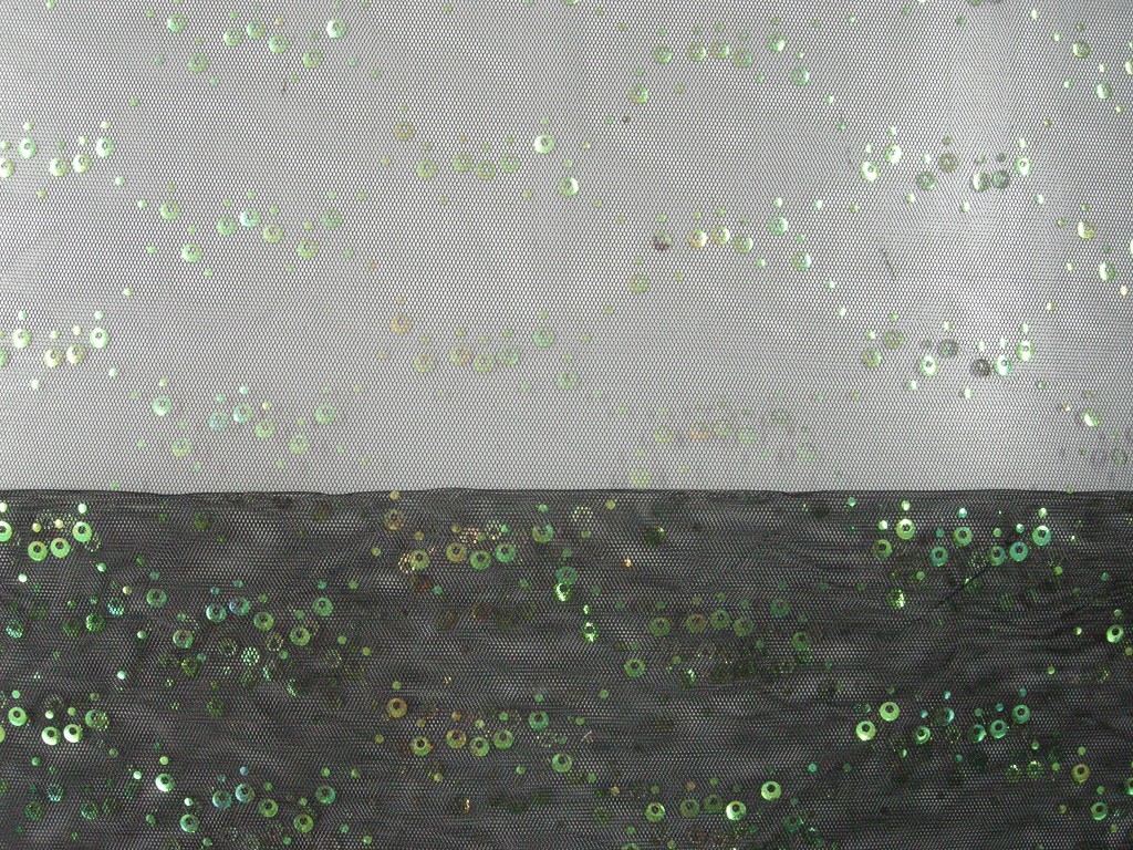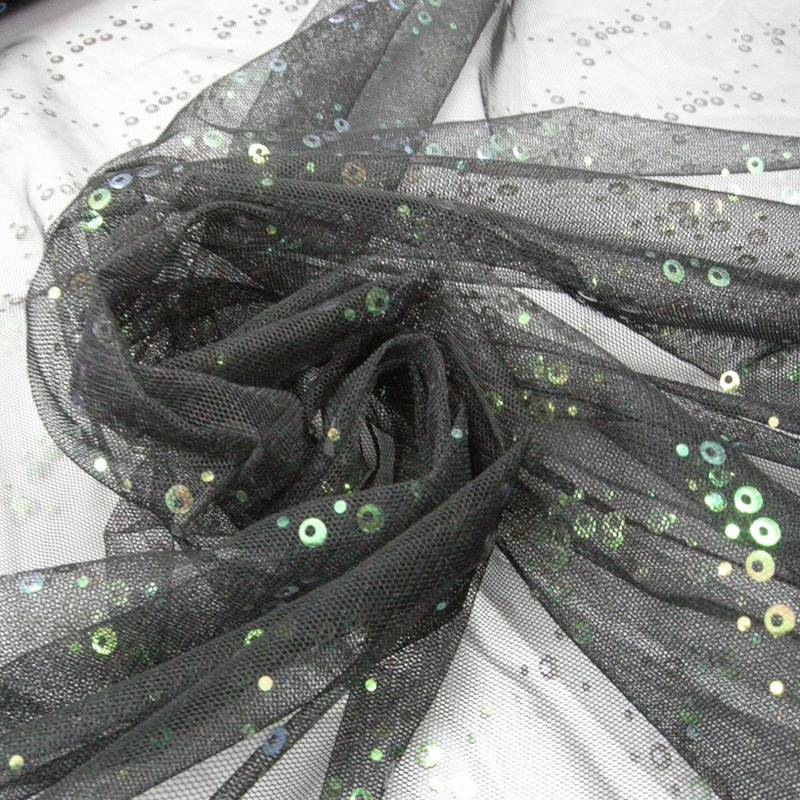 Tulle nero impreziosito da piccole paillettes applicate che, grazie alle loro sfumature nelle tonalità del verde e dell’azzurro, donano una luminosità delicata e raffinata alla superficie.