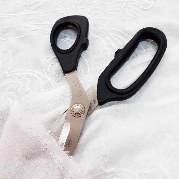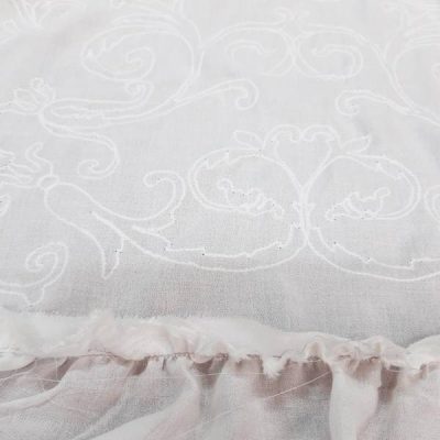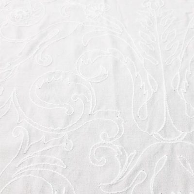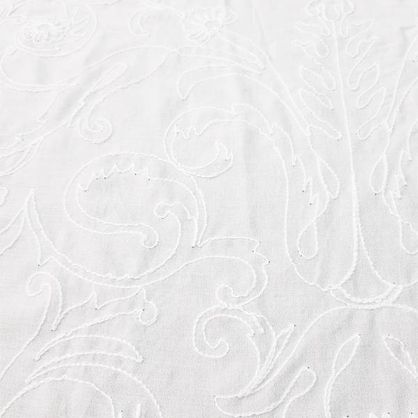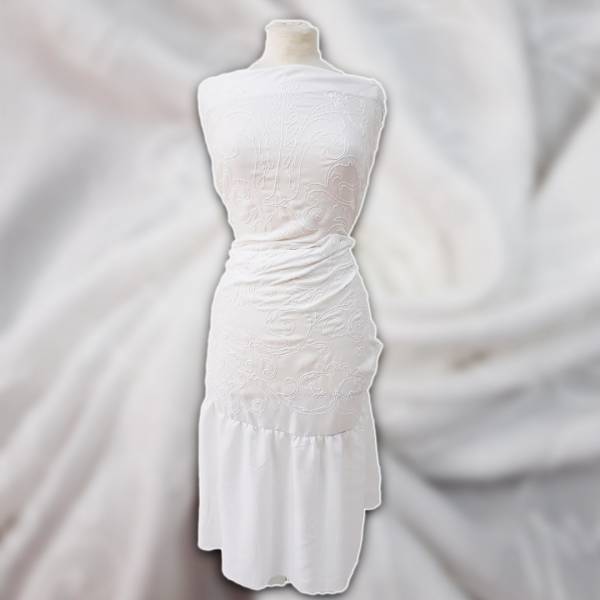 Questa stoffa si presenta come una viscosa tinta unita in tonalità bianco naturale, arricchita da un raffinato ricamo floreale in tono su tono.