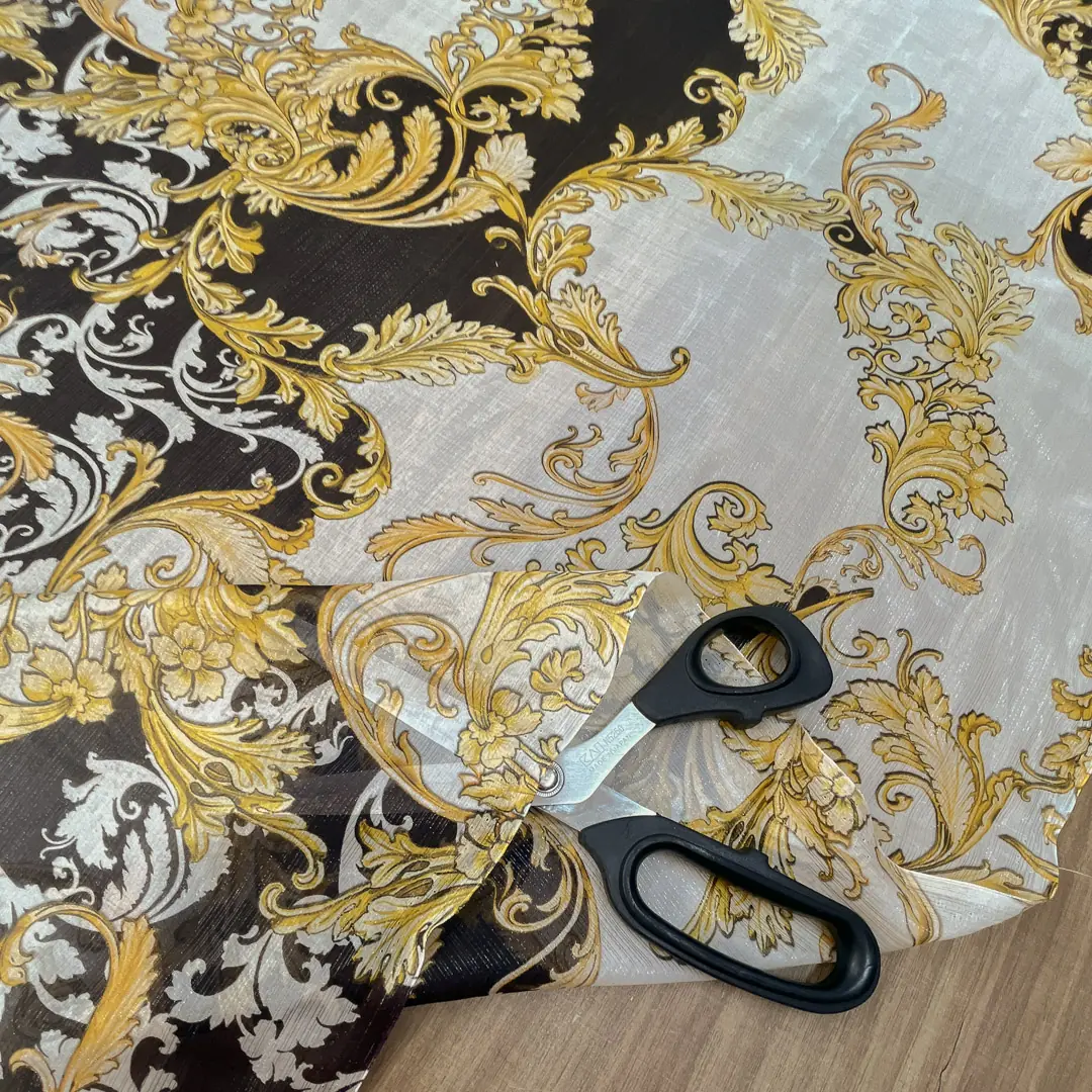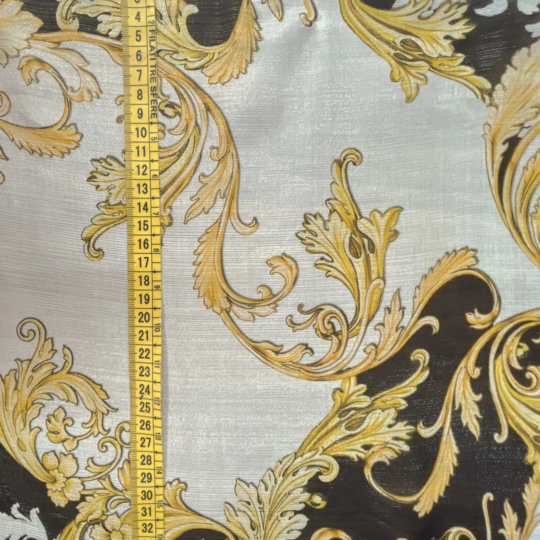 Questo contrasto cromatico esalta la ricchezza del disegno, conferendo un’estetica opulenta e sofisticata. Il dorato cattura la luce e crea riflessi cangianti, mentre il nero aggiunge profondità e intensità visiva, garantendo un impatto scenografico degno delle creazioni più raffinate nel mondo della moda e dell’arredamento tessile.